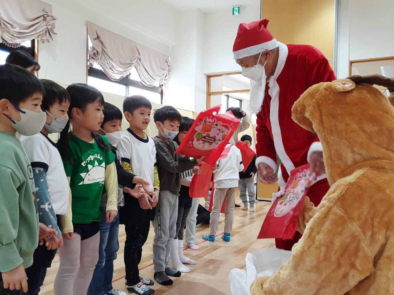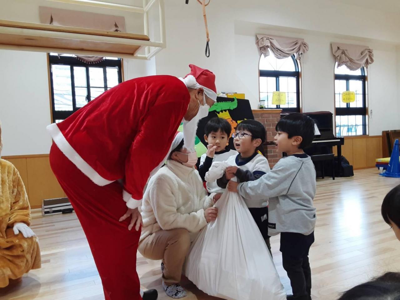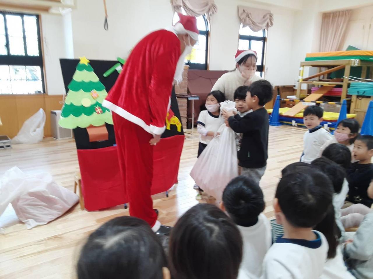 プレゼントをもらって一緒に記念写真を撮りました。ホールを出る時は、サンタさんとハイタッチをして嬉しそうな子どもたち、とっても楽しいクリスマス会になりました。