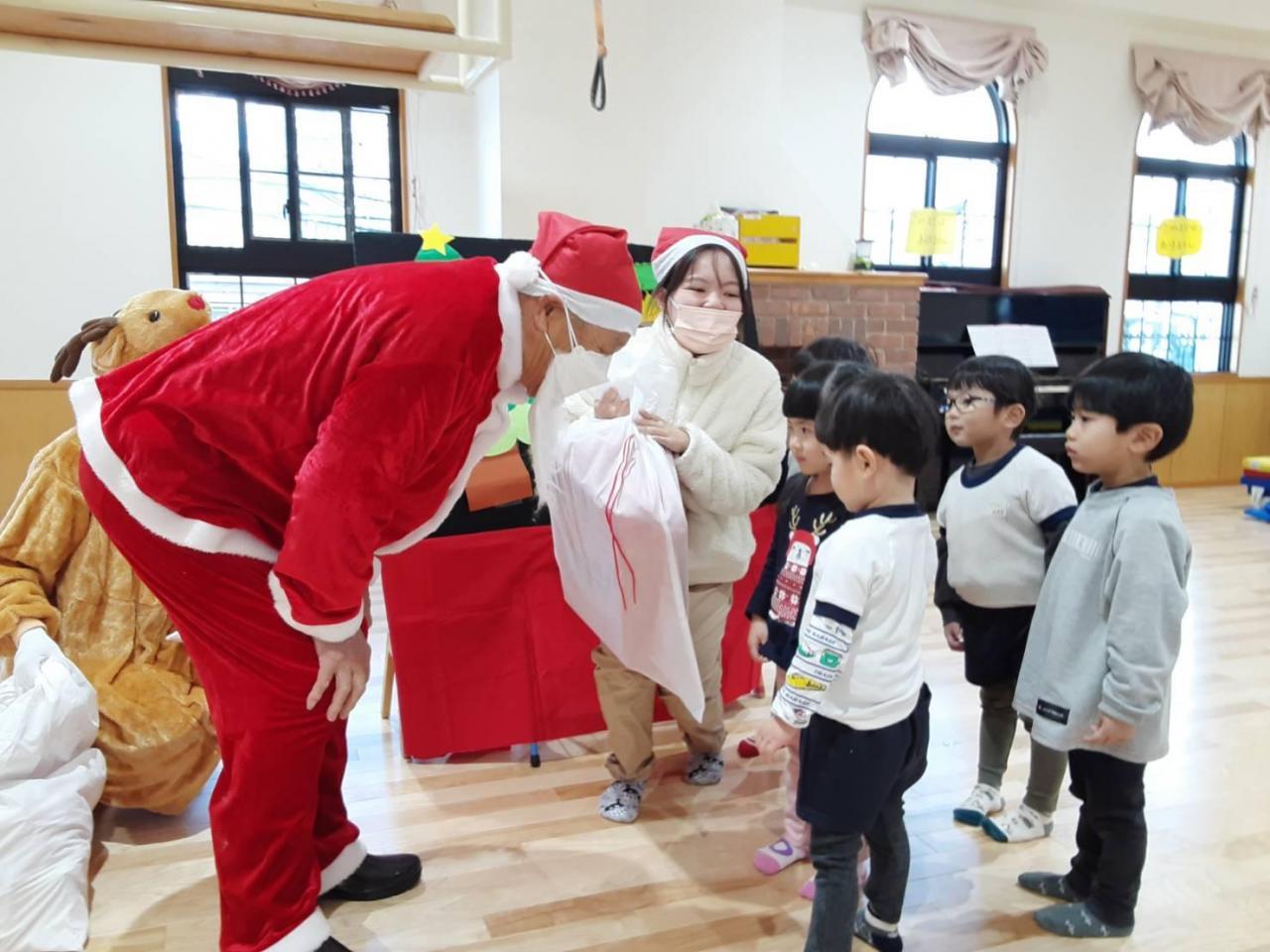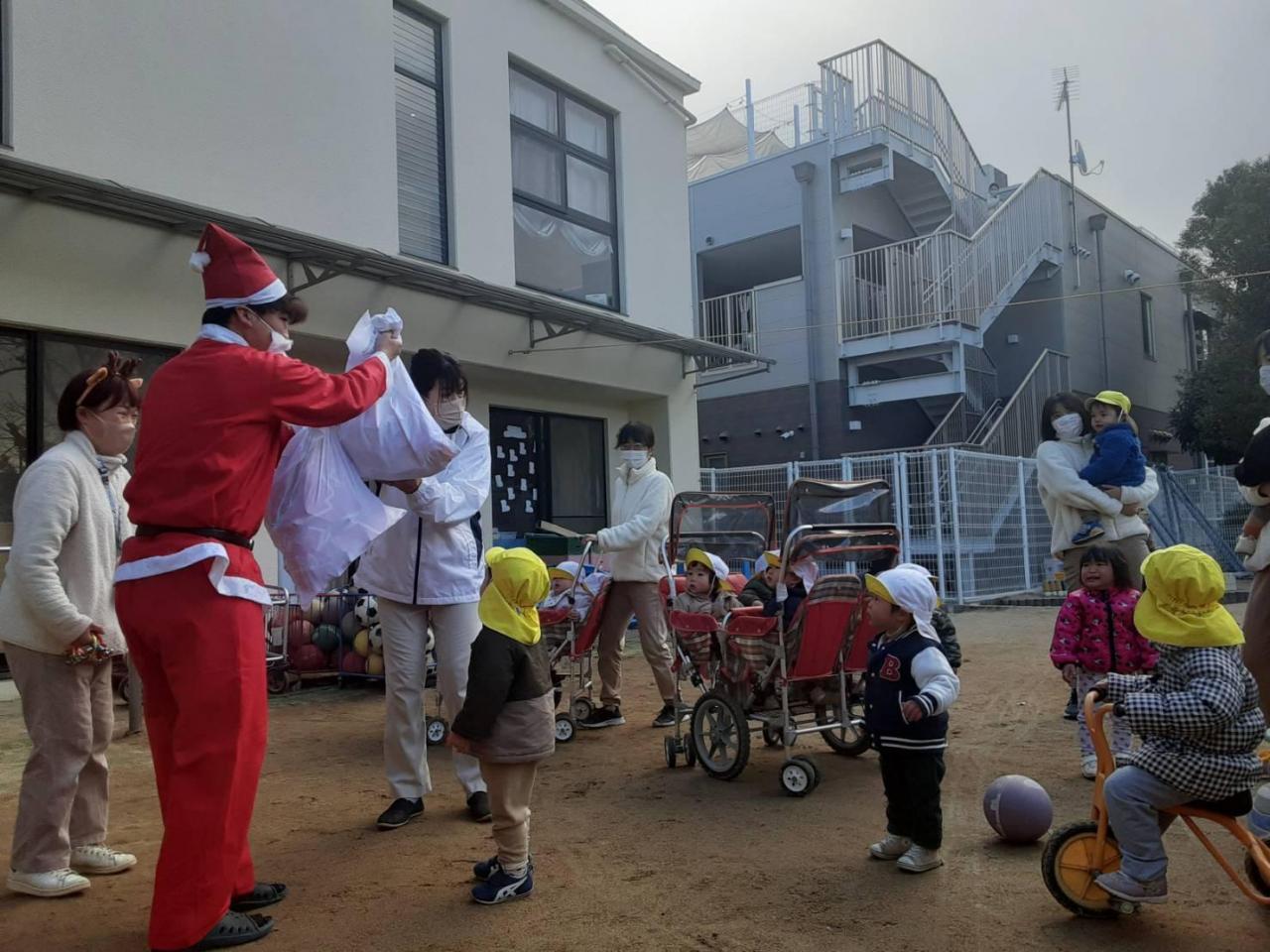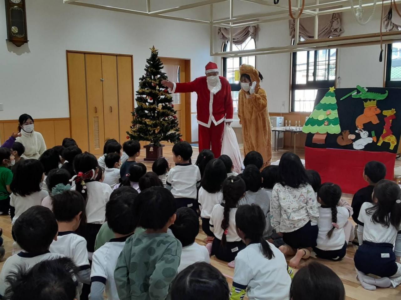プレゼントをもらって一緒に記念写真を撮りました。ホールを出る時は、サンタさんとハイタッチをして嬉しそうな子どもたち、とっても楽しいクリスマス会になりました。