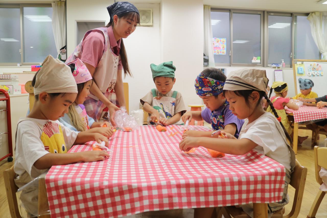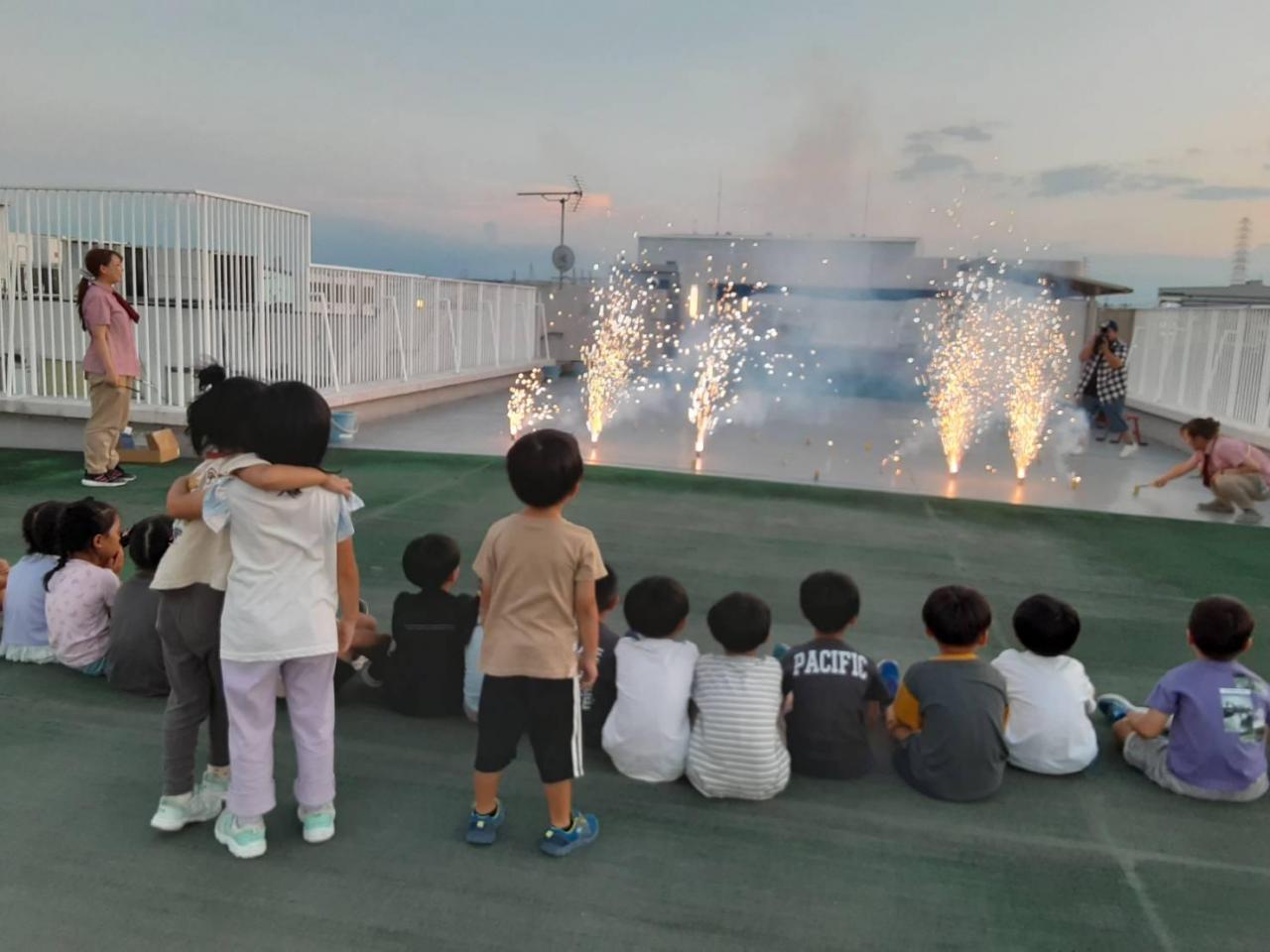 午後にはカレー作りや園内かくれんぼ、楽しみにしていた花火など盛りだくさんでした。そしてみんなで屋上に行き、星や夜の景色を見ました。「そとまっくらだ~」「おほしさまいっぱいある!」と、友だちと話をしていました。
