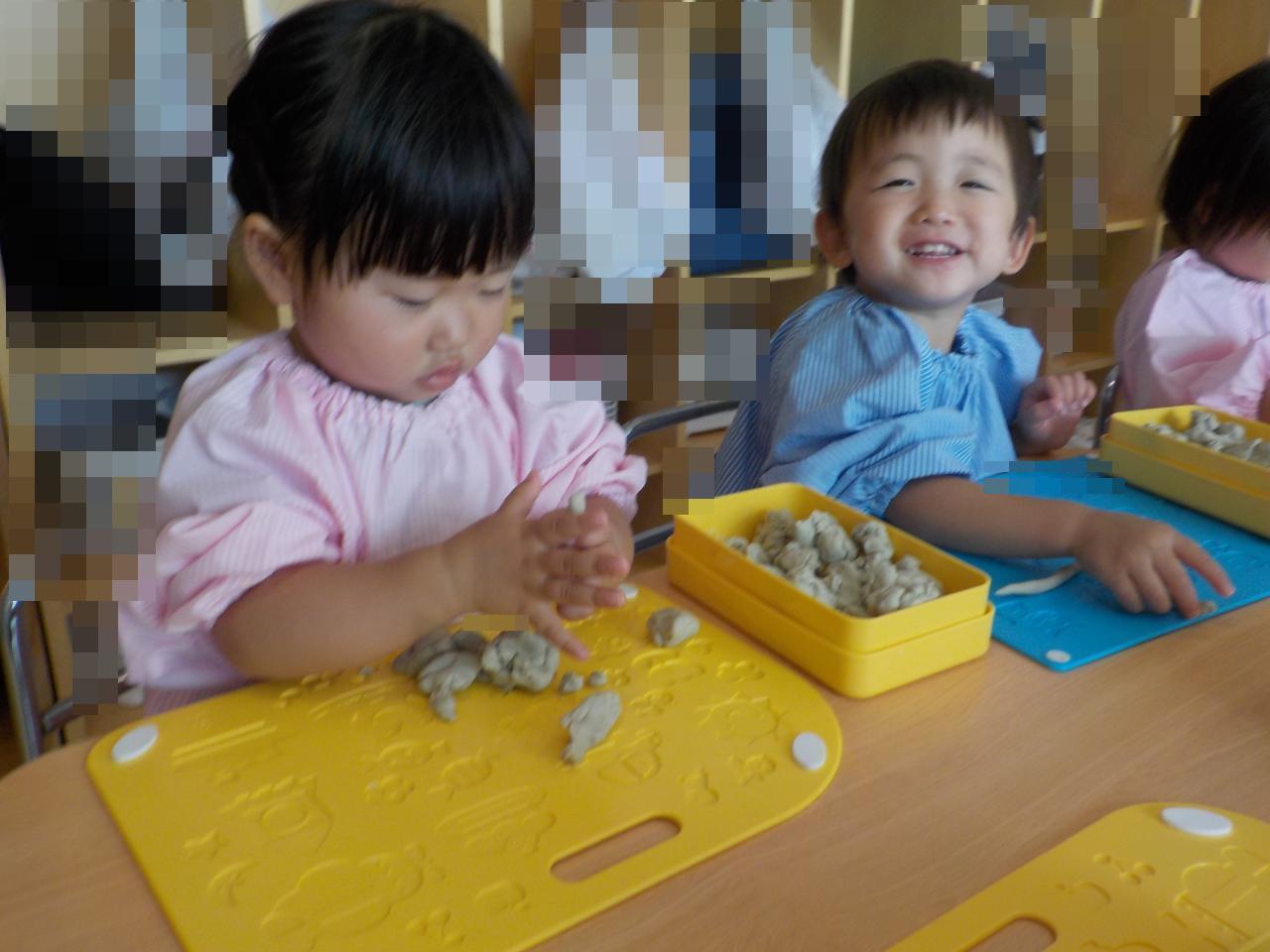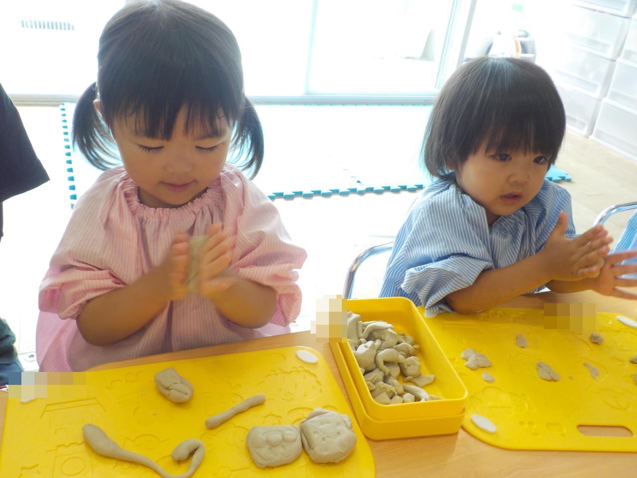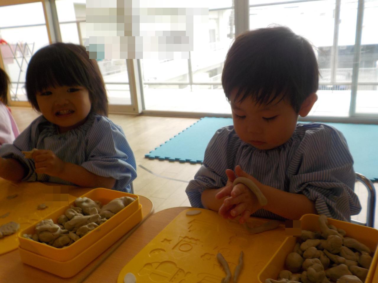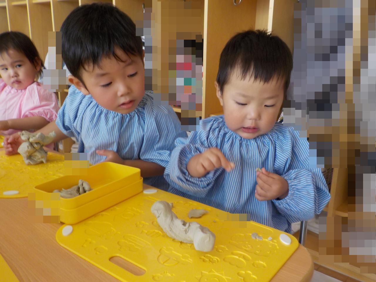 粘土を丸めたり、ちぎったりして遊んでいます❗