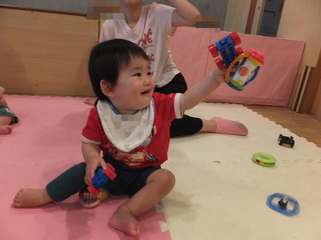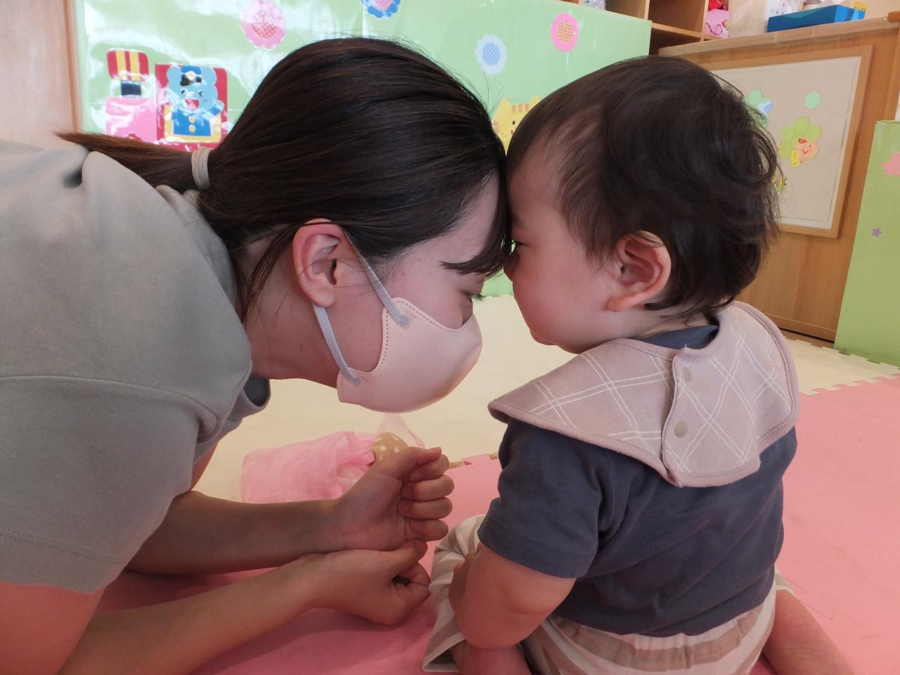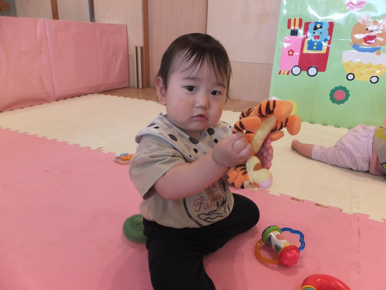お部屋では、好きなおもちゃを見つけて遊んだり、保育者とふれあいあそびをしたりして楽しんでいますよ。