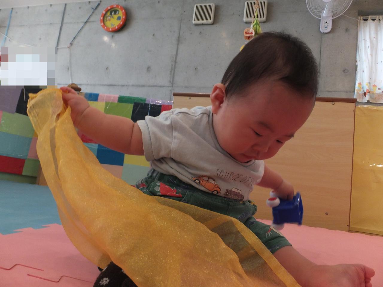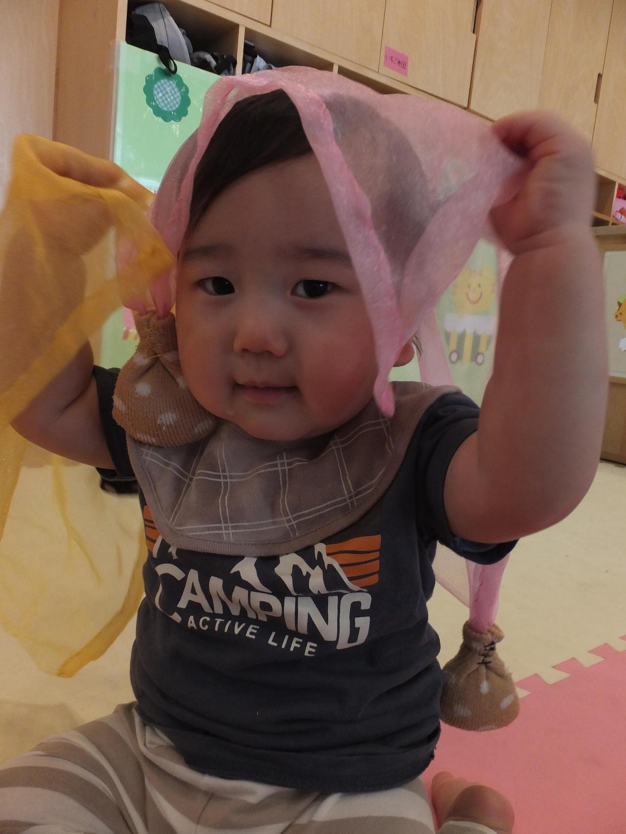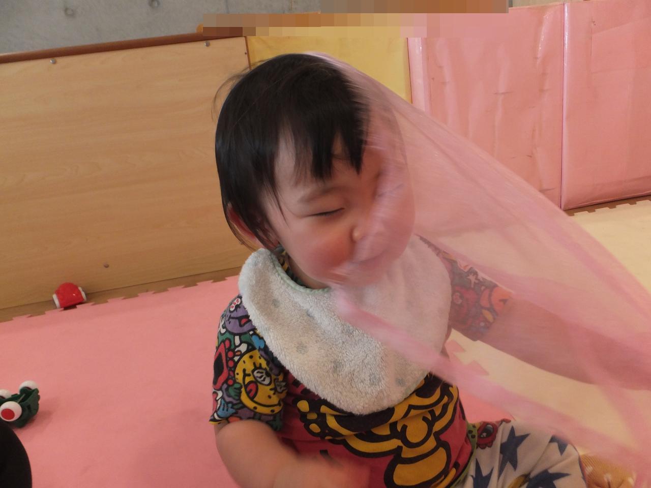 いないいないばあ大好き!オーガンジーの布をかぶって「ばぁ!」と顔をだしてくれますよ。