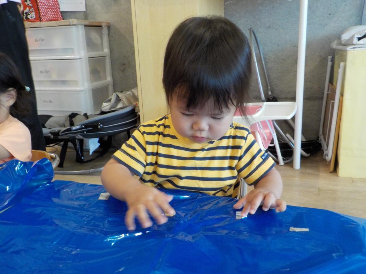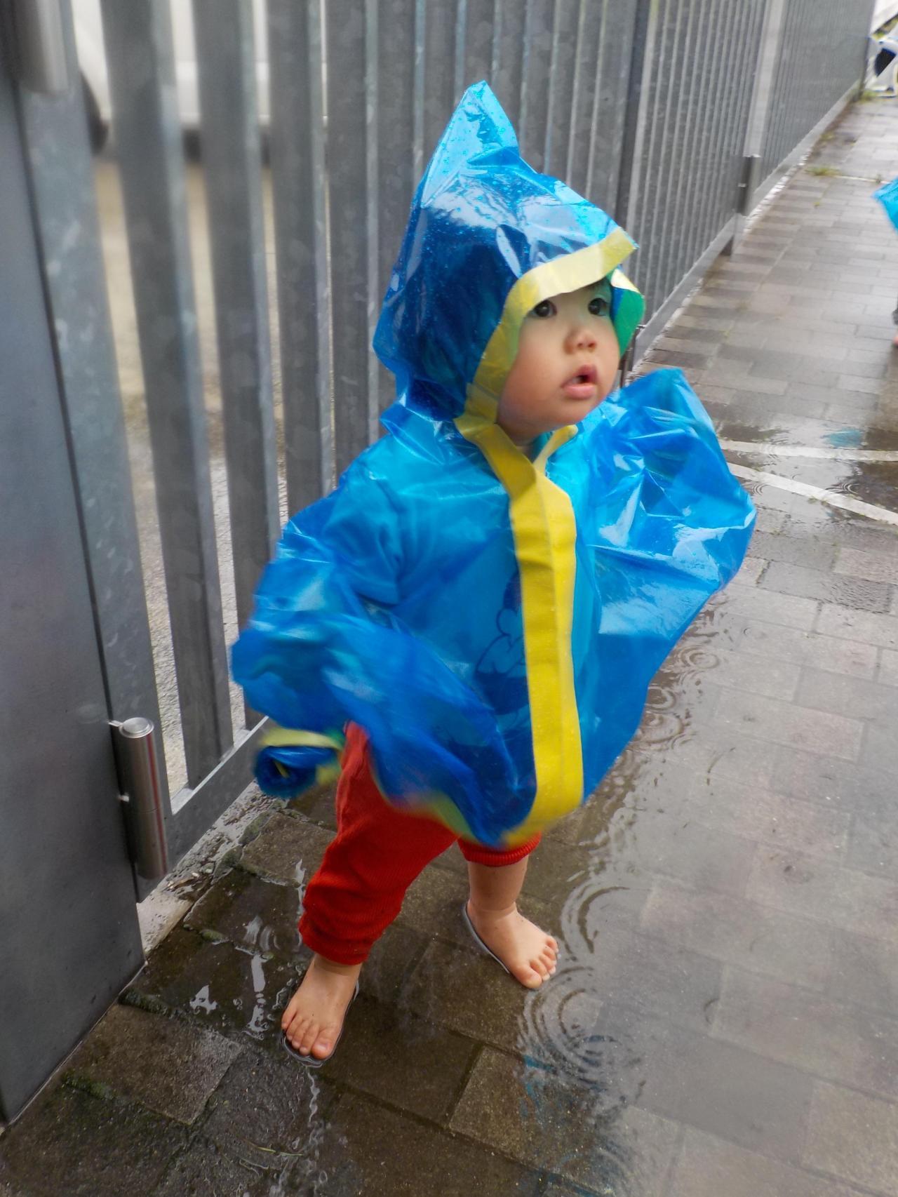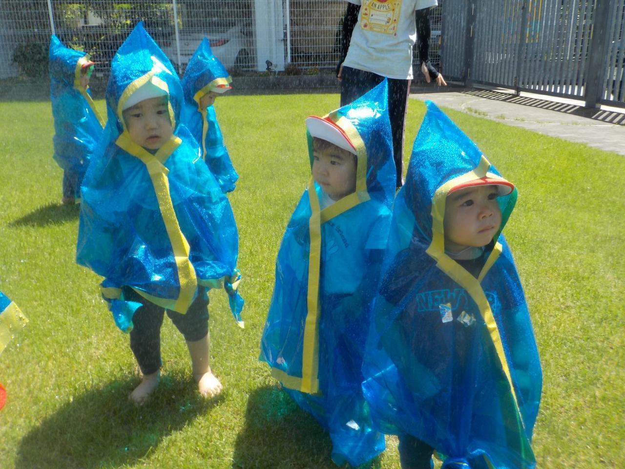 カラーポリ袋にキラキラシールを貼り、自分だけのレインコートを作って雨あそびをしましたよ☔