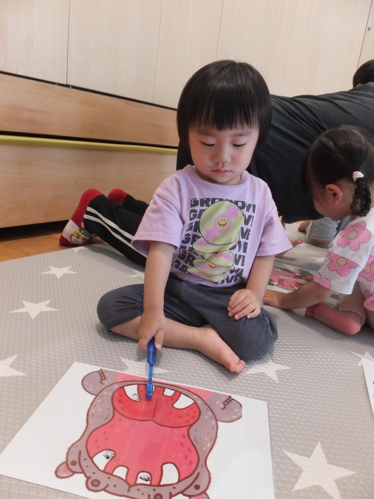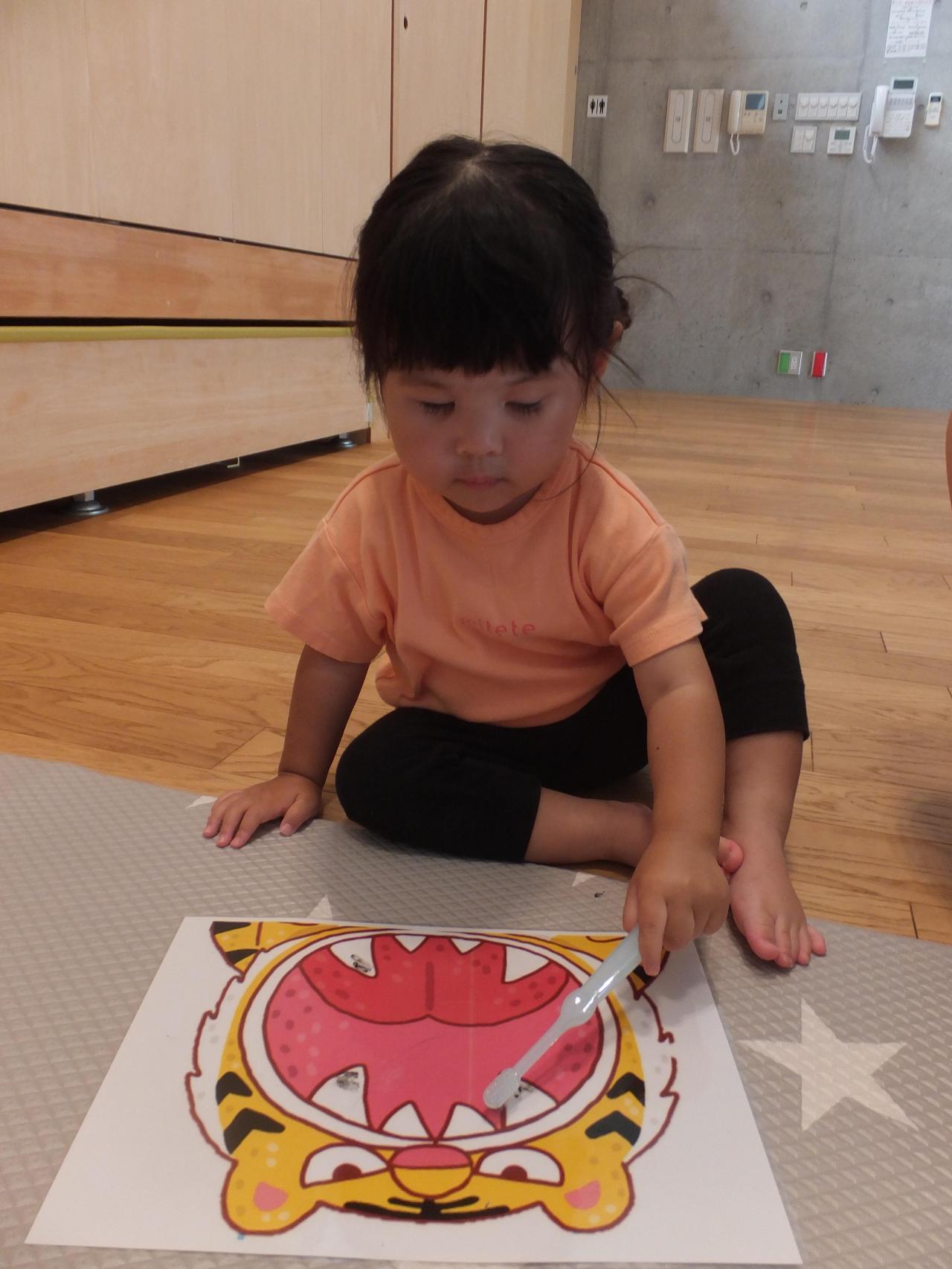 『はをみがきましょう』のうたを歌ったり、「しゅっしゅっしゅ~」と言いながら磨いたりしていましたよ!