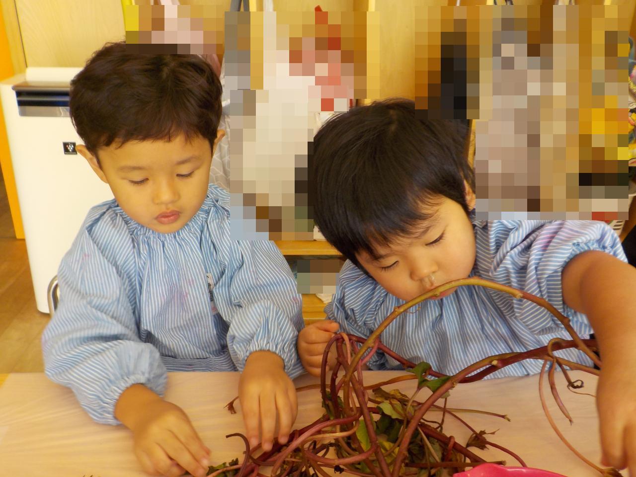 先日みんなで収穫したさつまいもの葉っぱを使って、自由画をしました。
