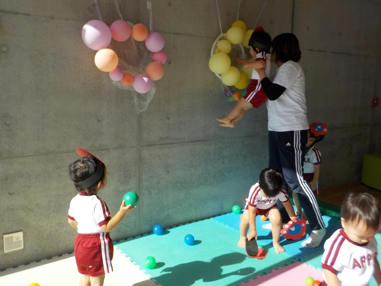 ピンクと黄色のかわいいミャクミャクの中にボールを入れていますよ。