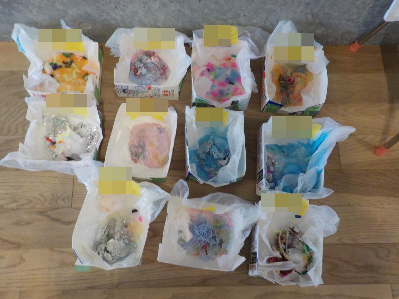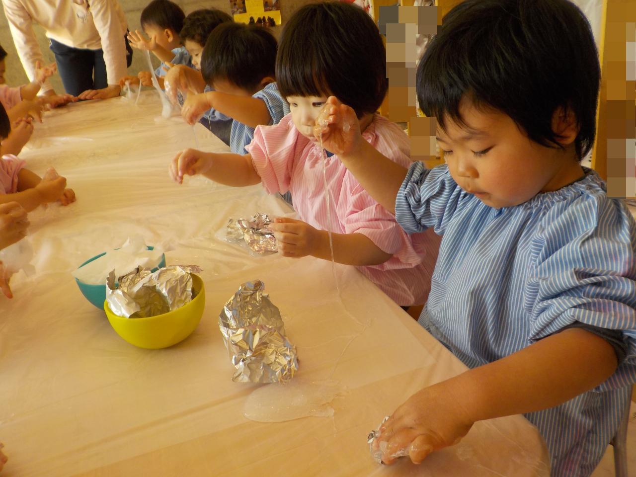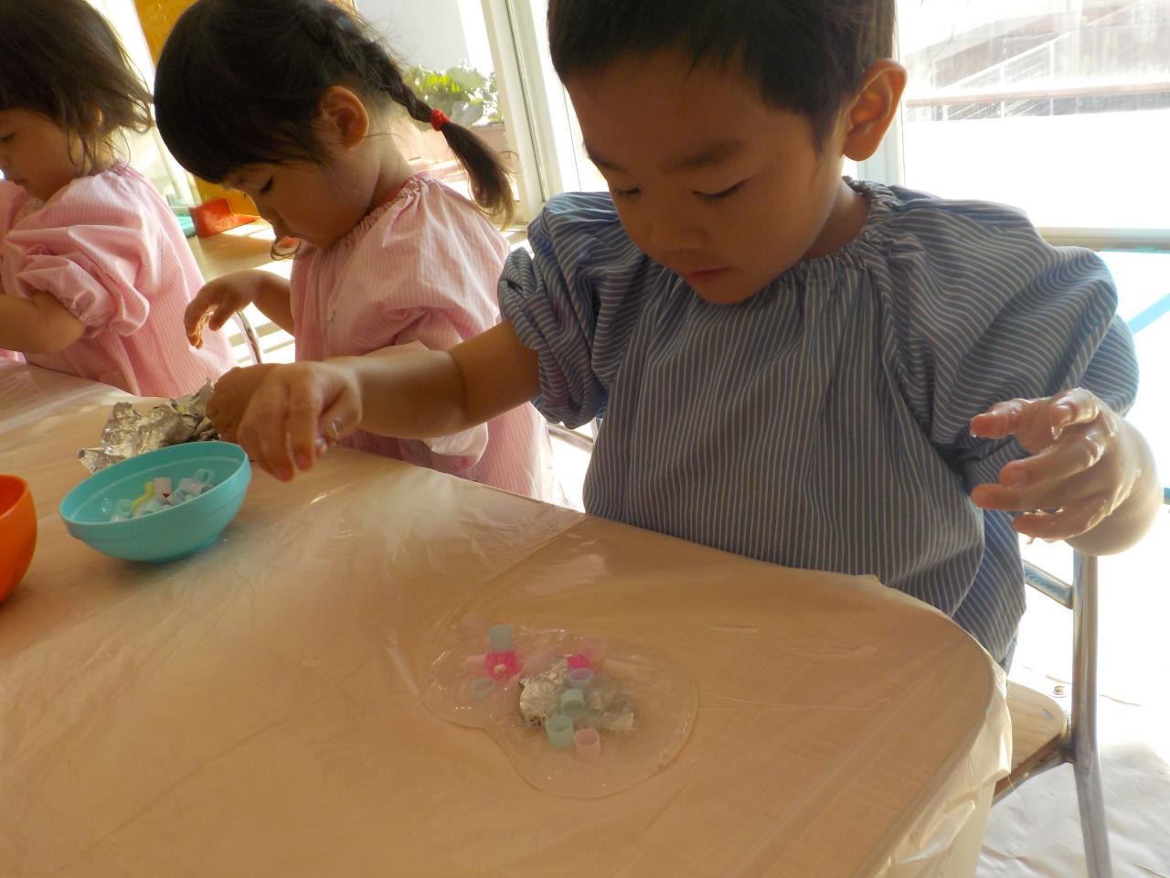 スライムにティッシュやアルミホイル、ストローを自分で選んで混ぜ込んだり、色を付けたりしました。
