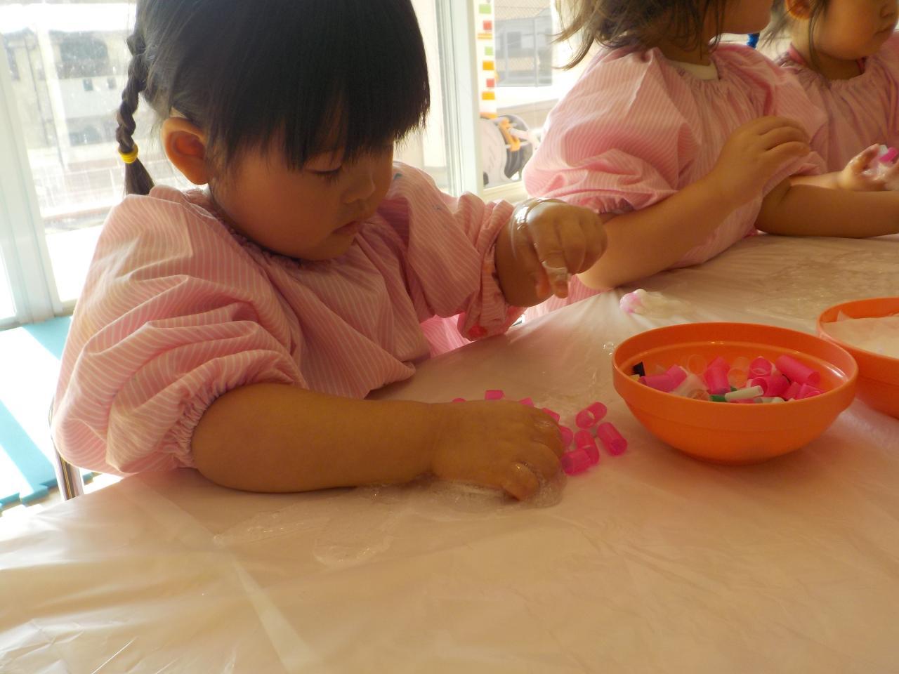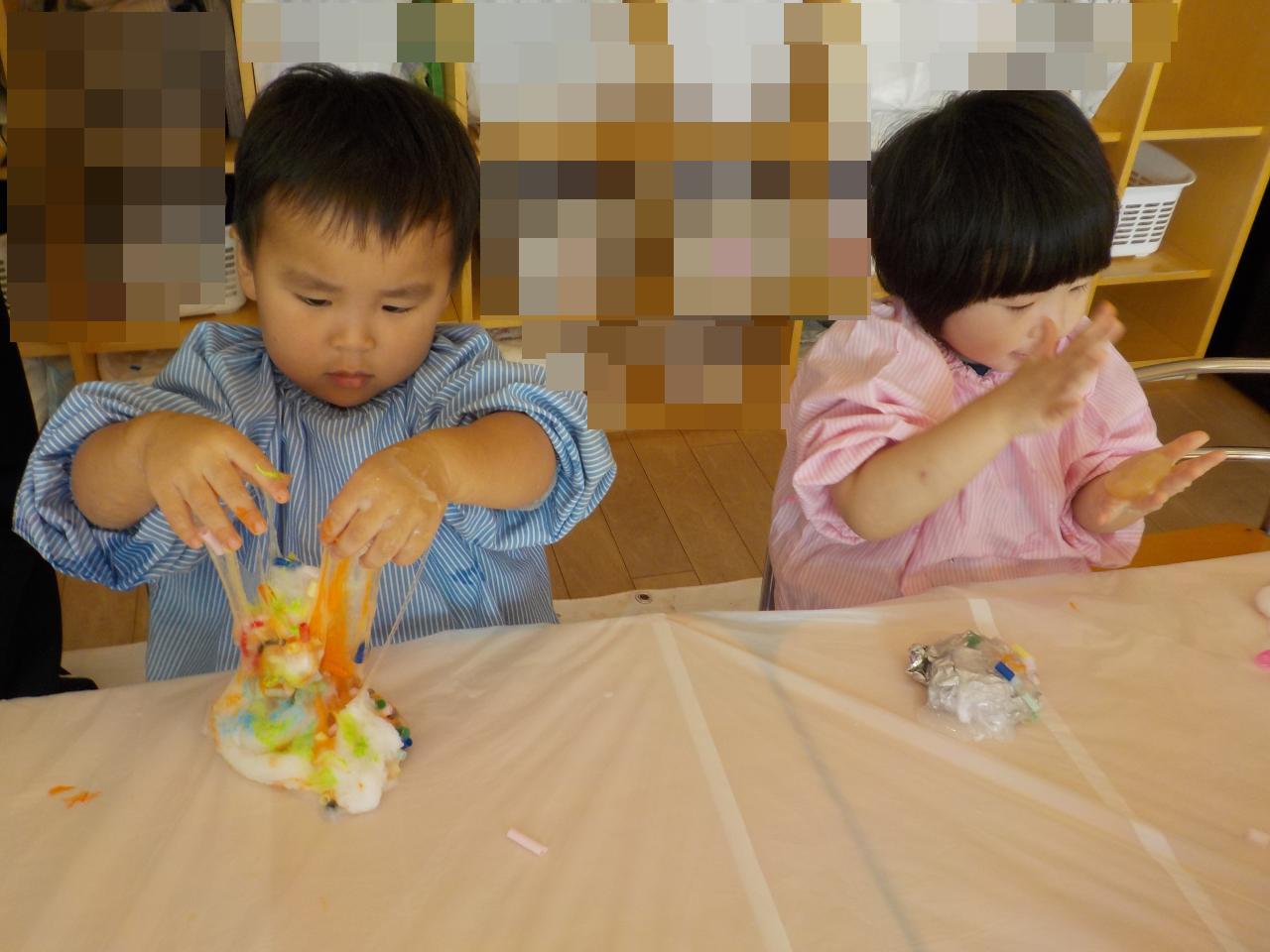 たくさん取り組んできた感触あそびも、自分たちで遊び方を見つけるのが上手になってきました。