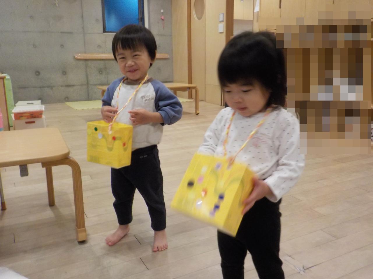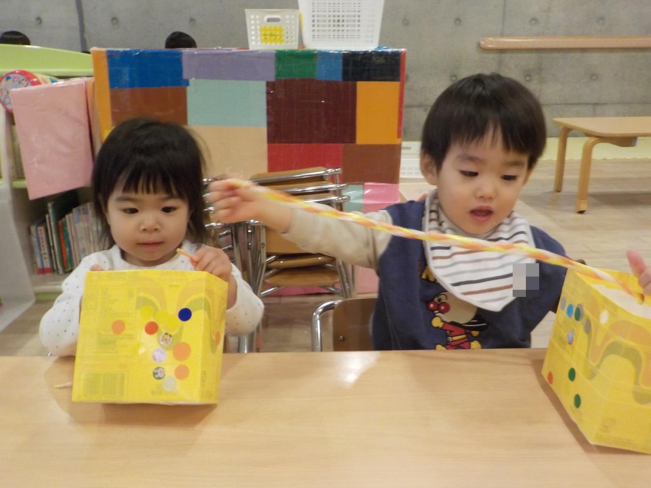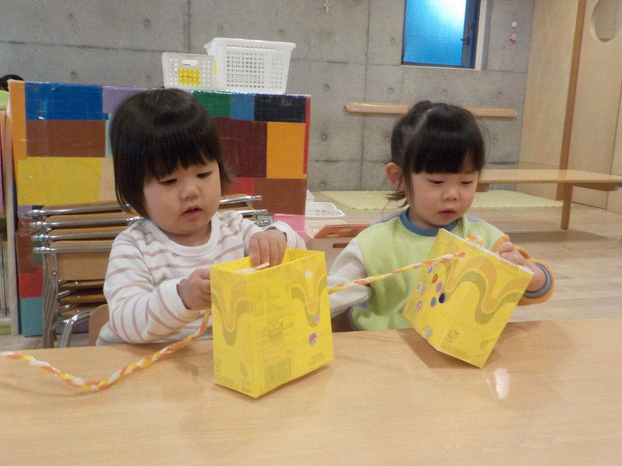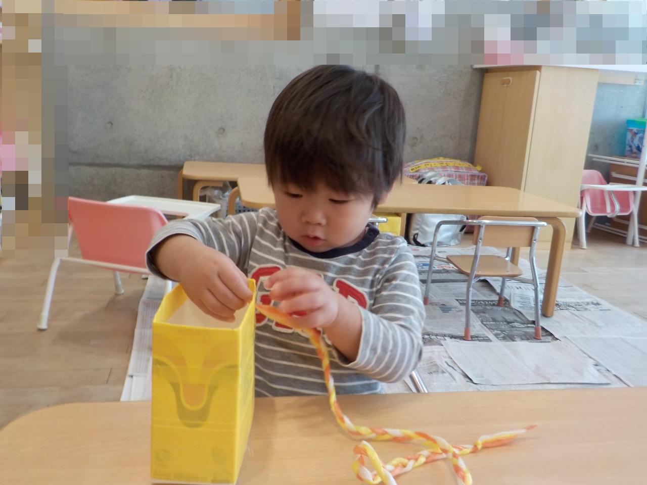 紐通しを楽しんでいる子どもたちに肩紐も通してもらいました!