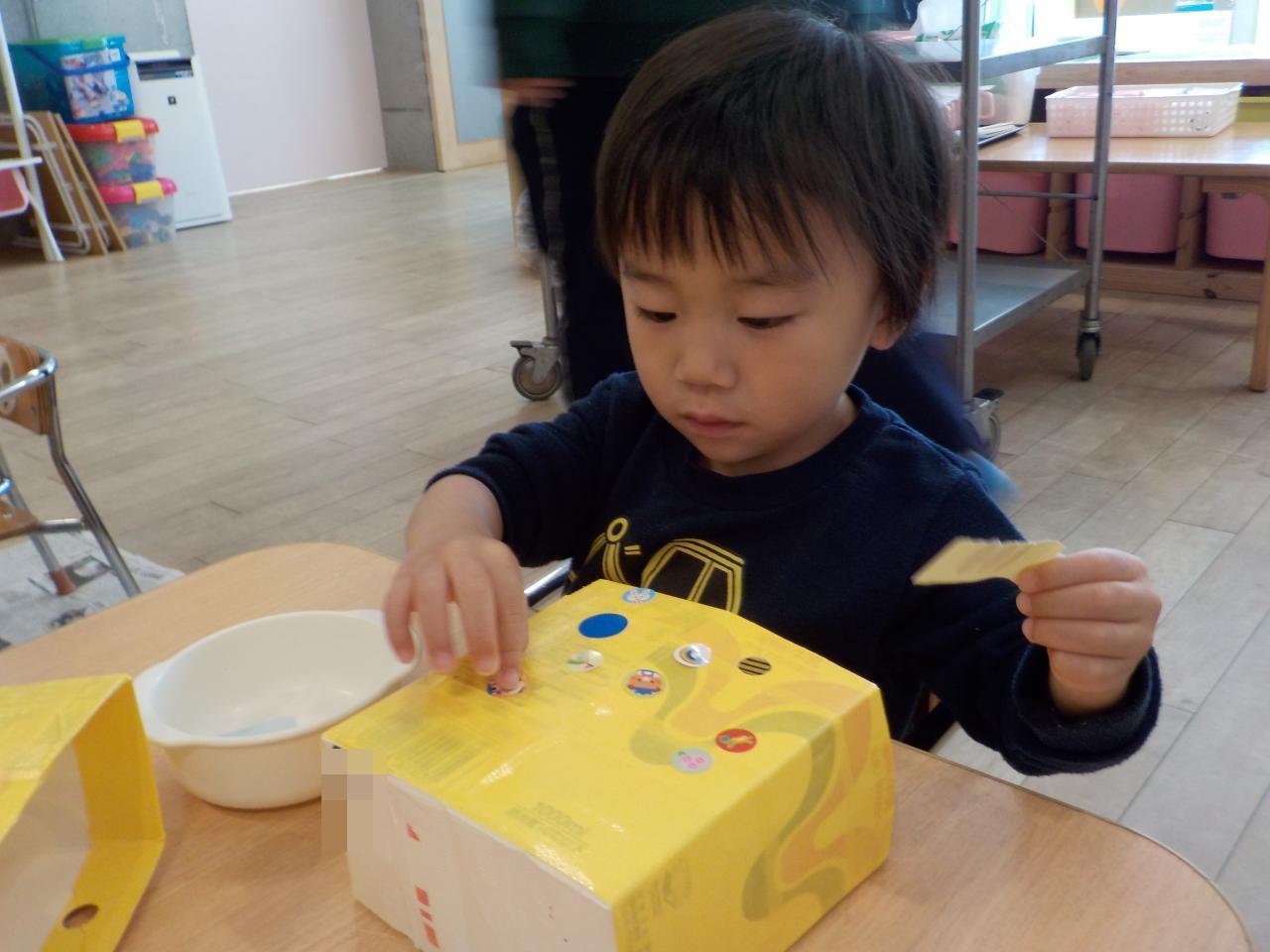 丸いシールを貼って自分だけのオリジナルバッグができましたよ👜✨