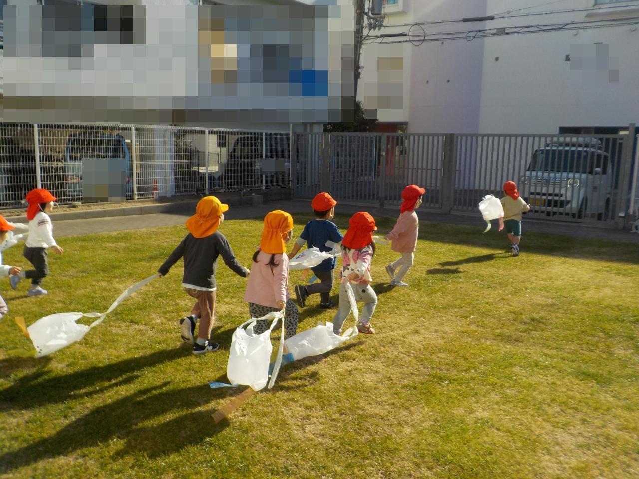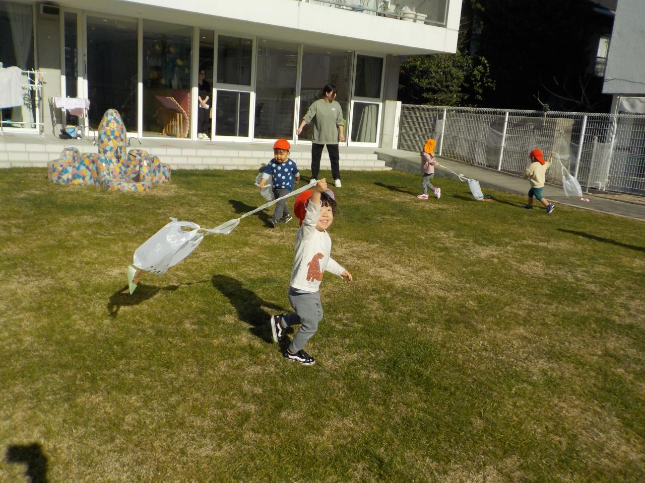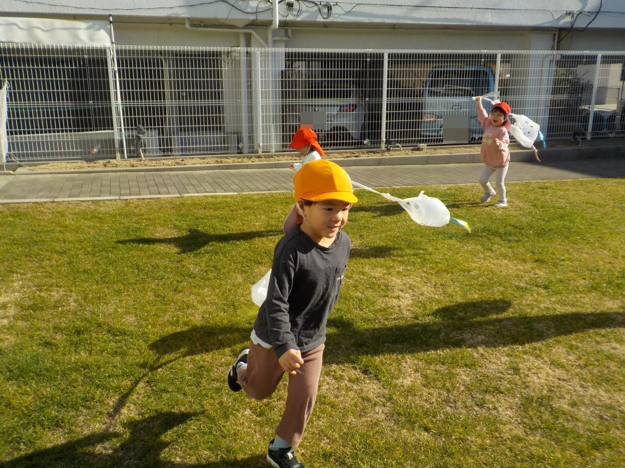 園庭でたこあげを始めると、みんな大はしゃぎで走り回っていました。