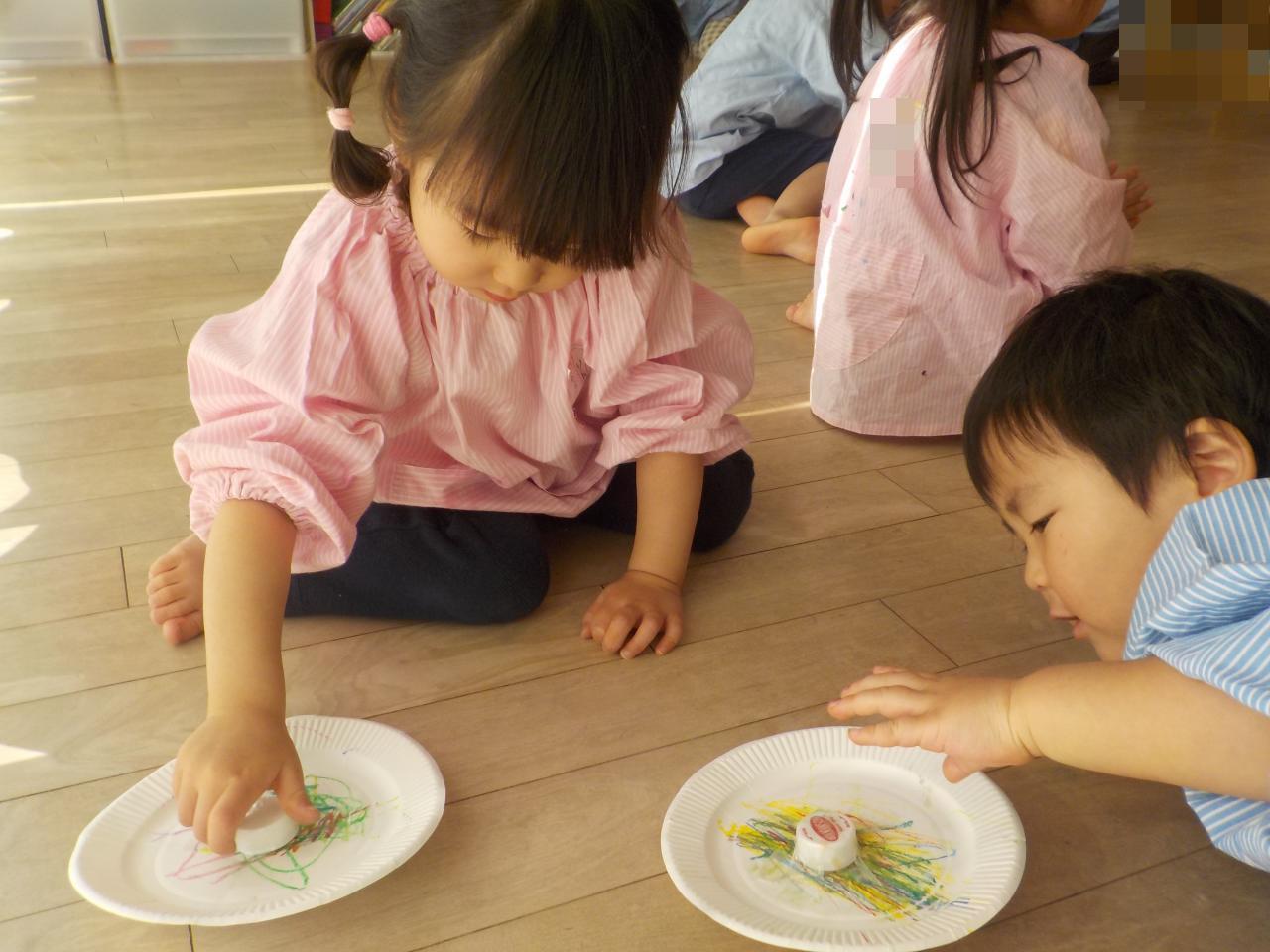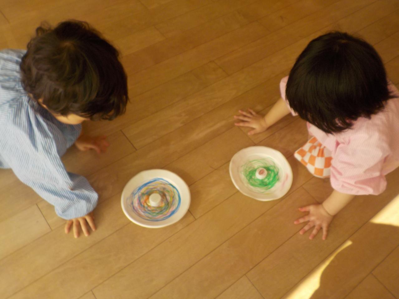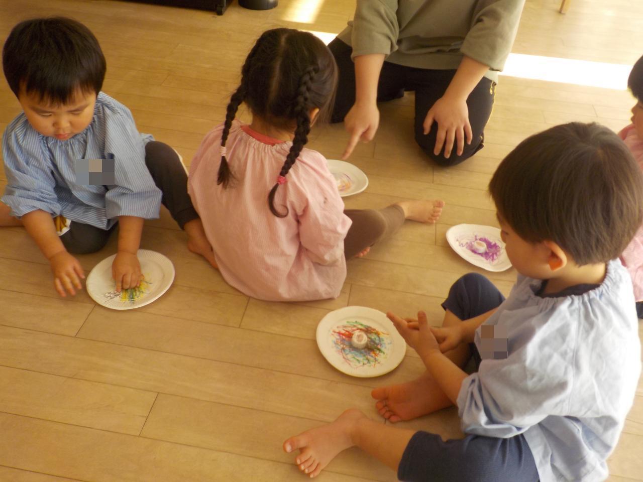 紙皿にクレヨンで模様を描き、オリジナルこまを作りましたよ!