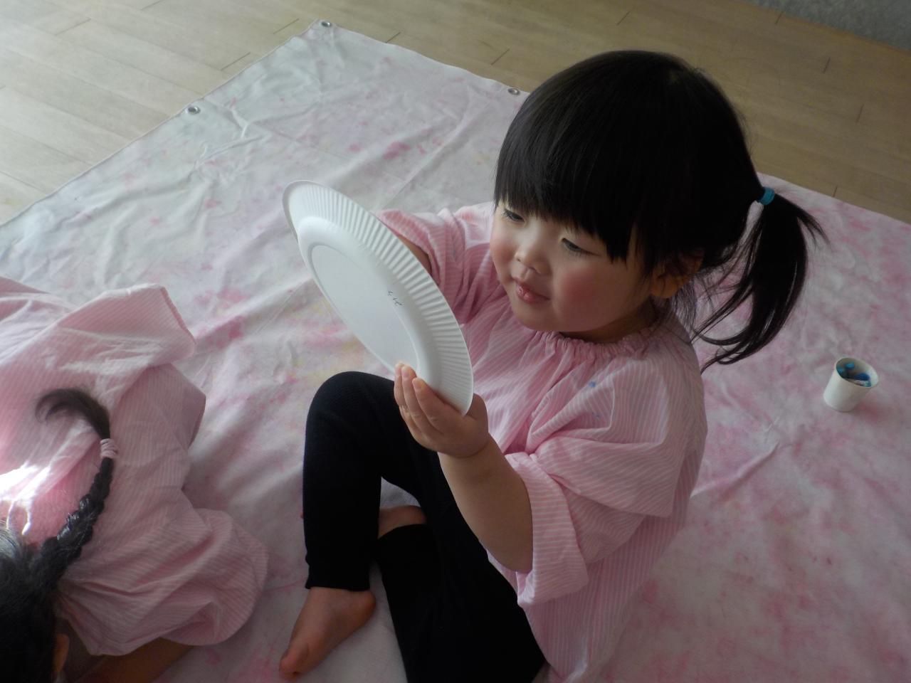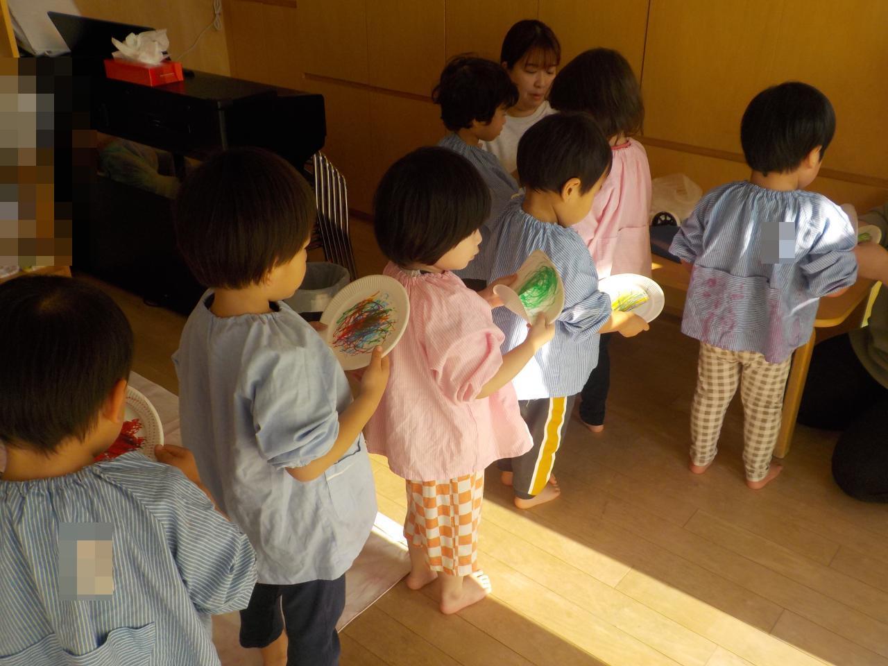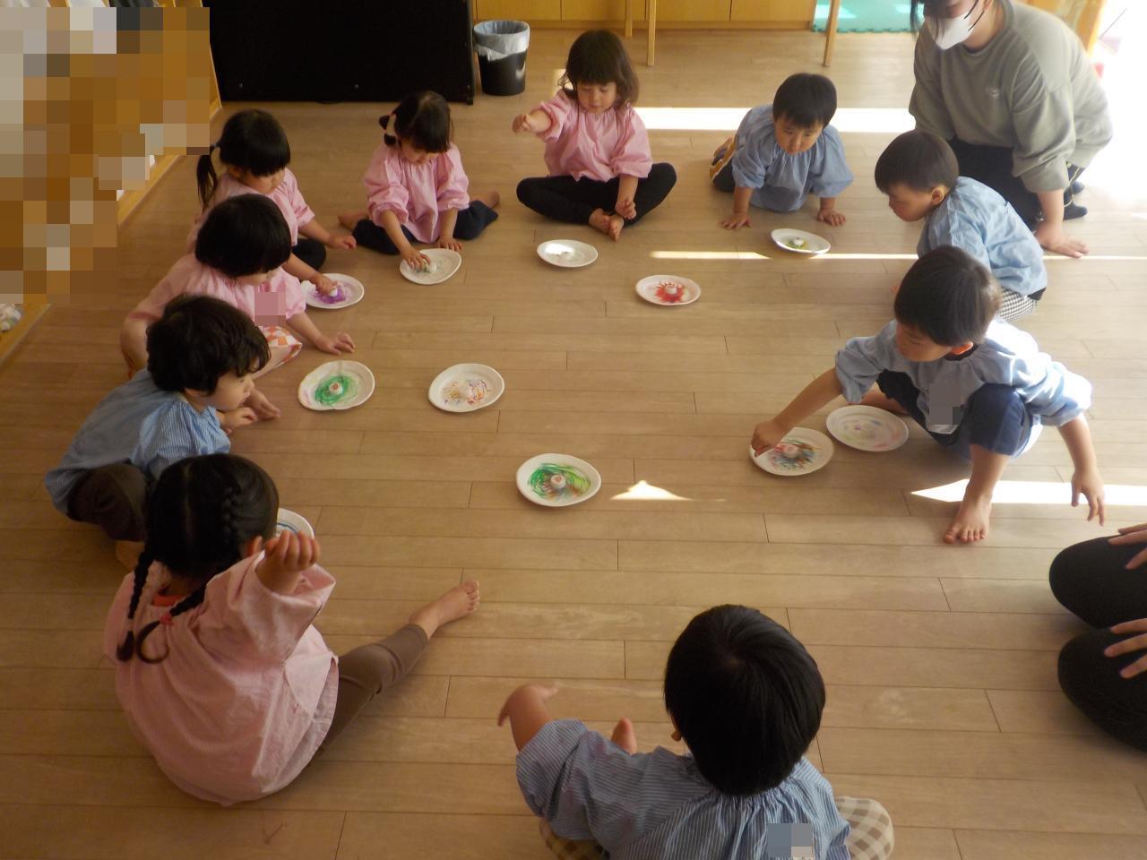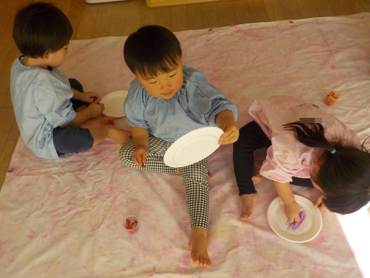 紙皿にクレヨンで模様を描き、オリジナルこまを作りましたよ!
