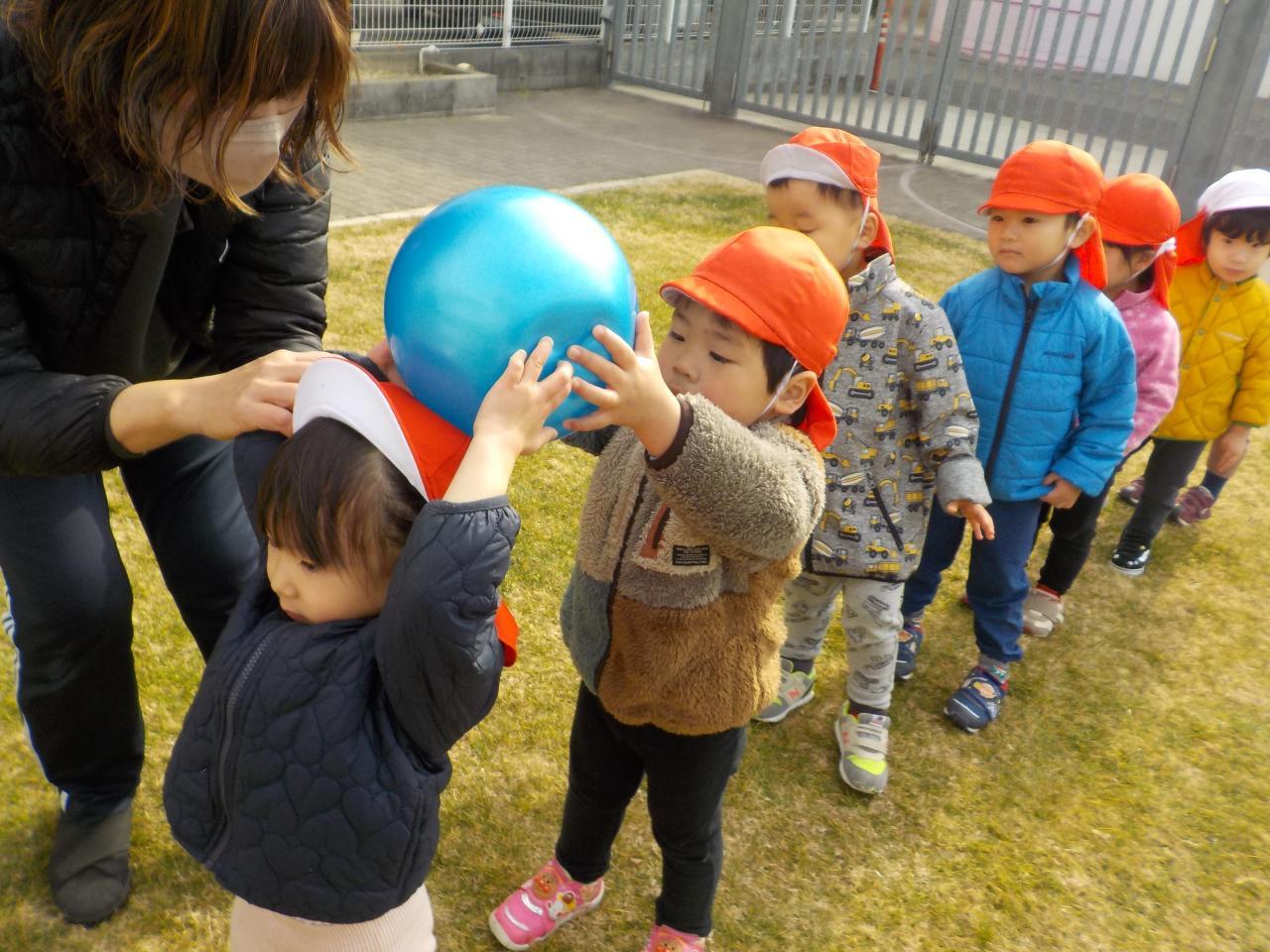 一列に並んで後ろの人にボールを渡していく、ボール渡しという遊びにも挑戦しました。