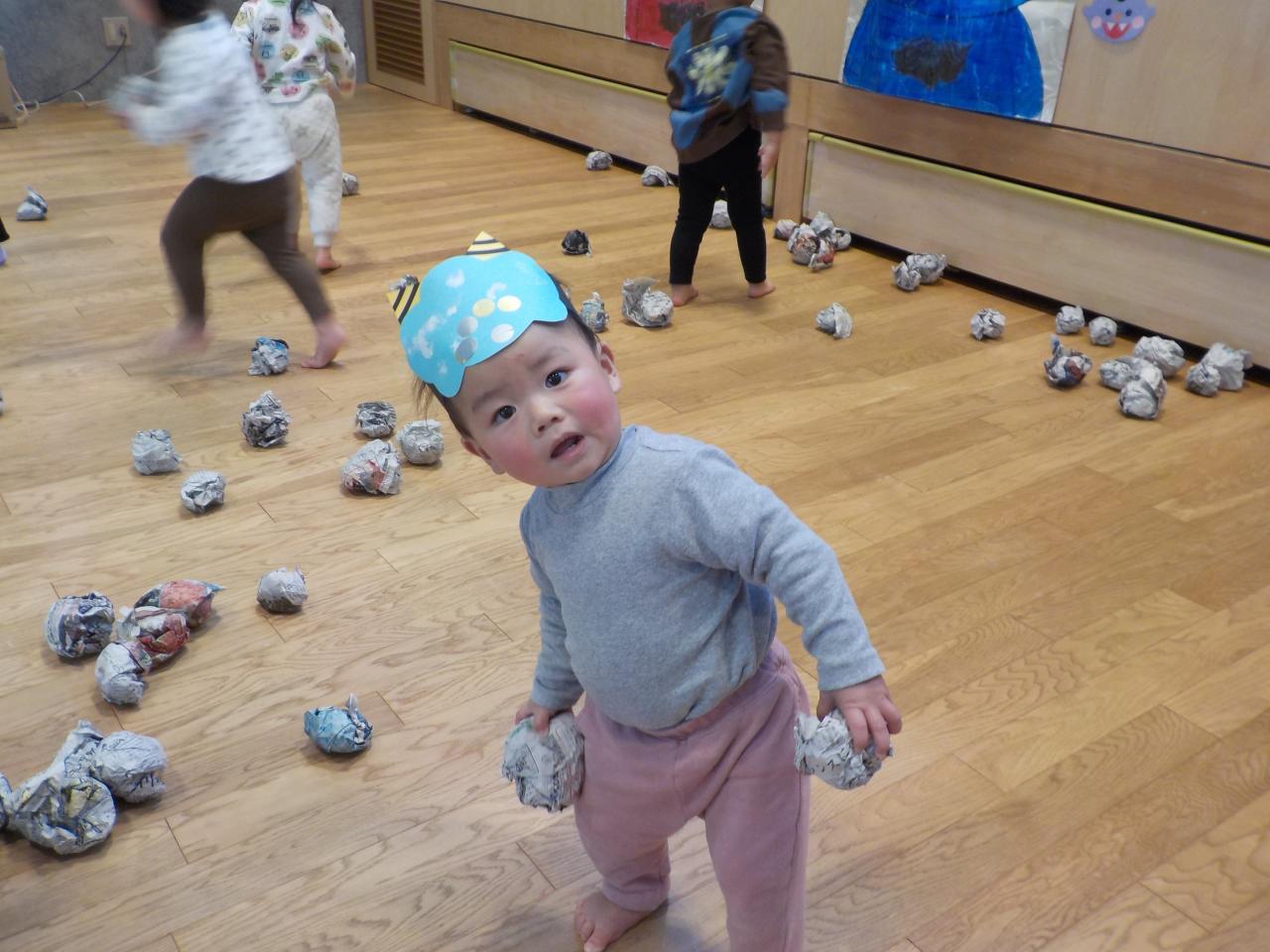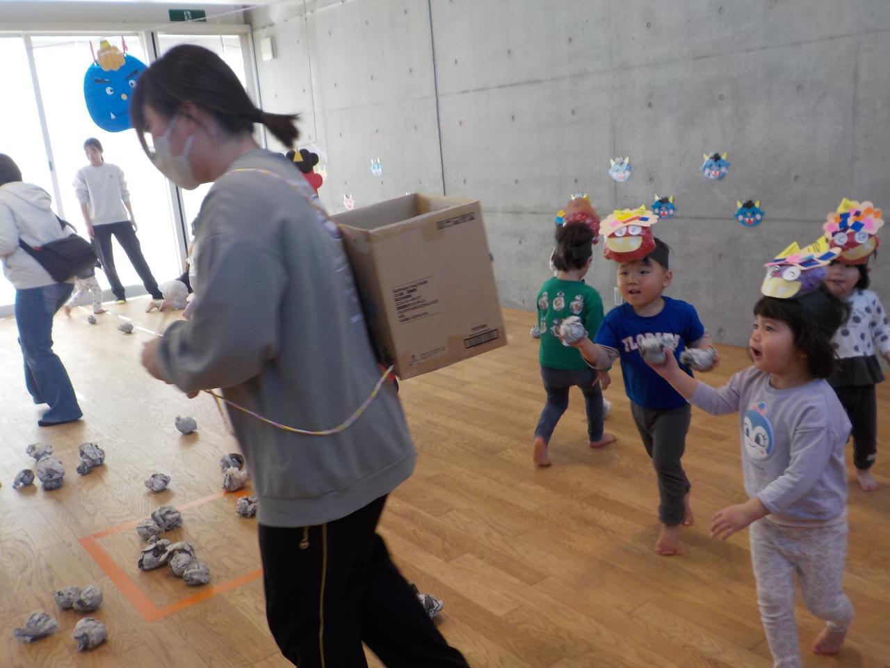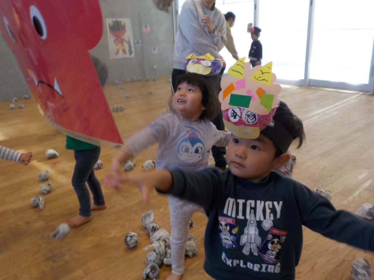 ホールに移動し、新聞ボールを豆に見立てて鬼退治をしました!