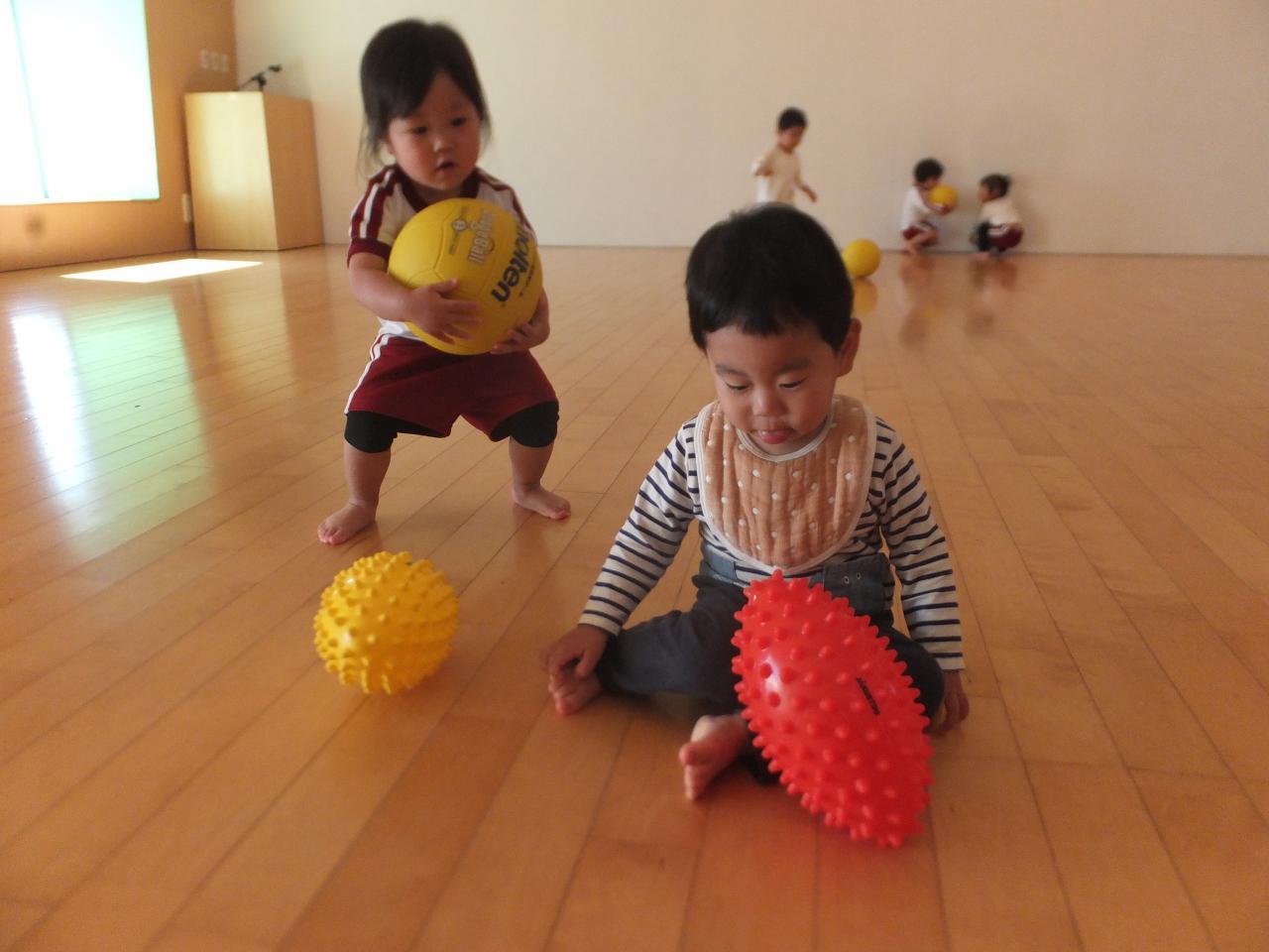 ボールが弾む様子を楽しんだり、先生と投げ合いっこをして遊んだり🎵