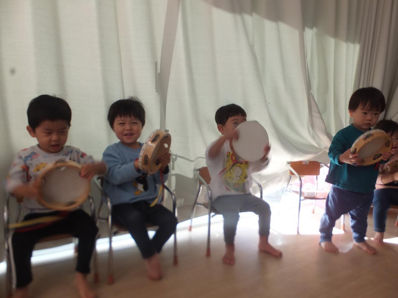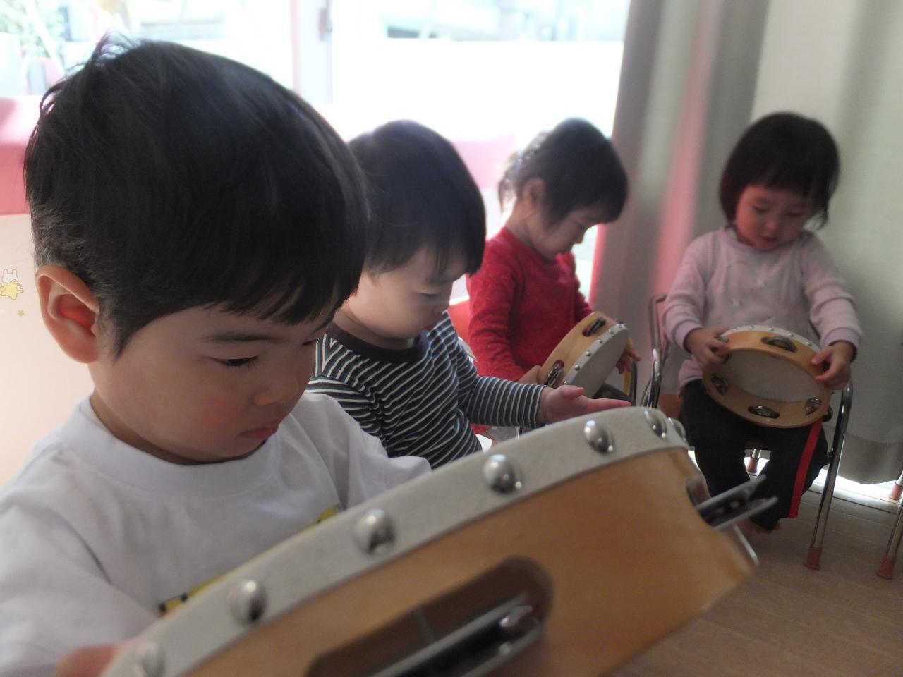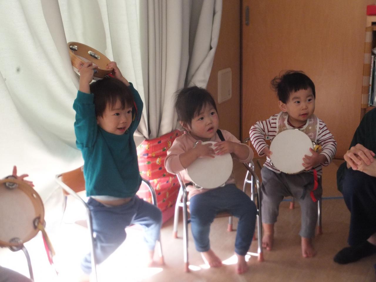 音を鳴らしたり、タンバリンを帽子やハンドルなど色々なものに見立てたりして遊びました🎵