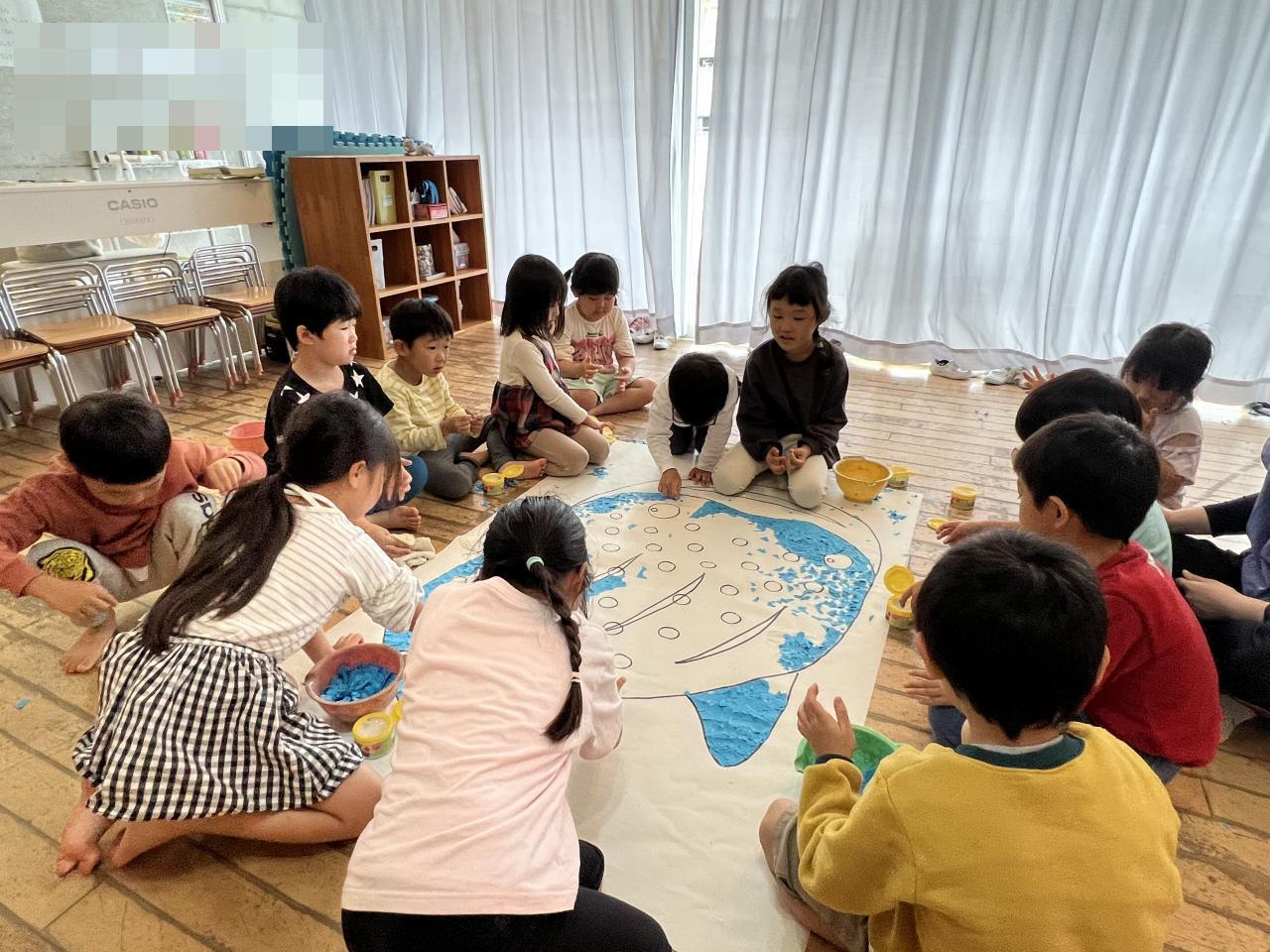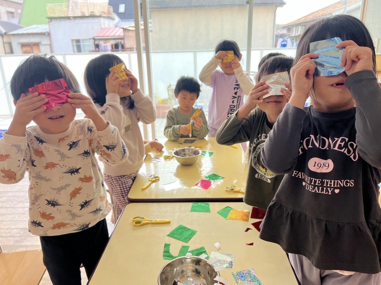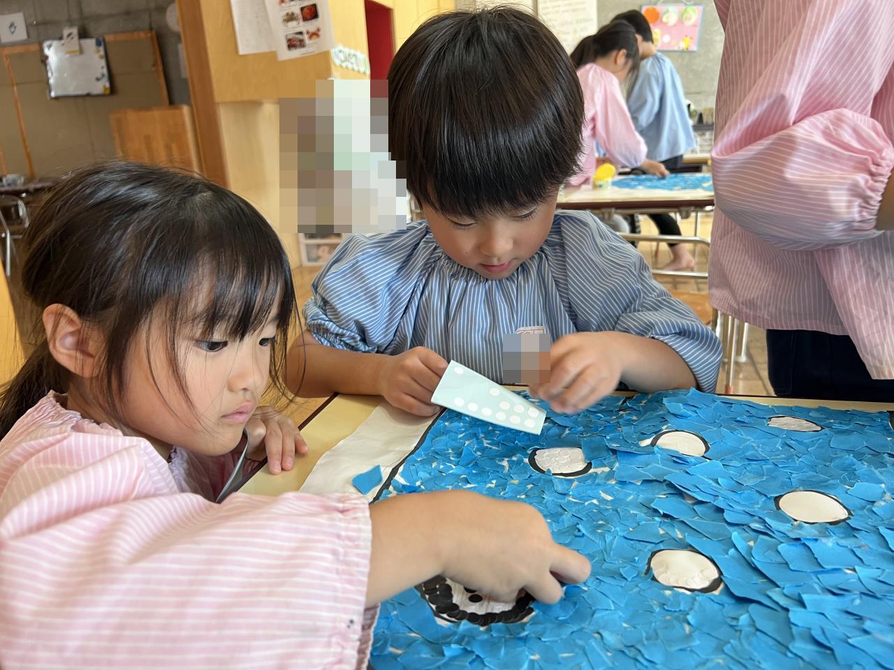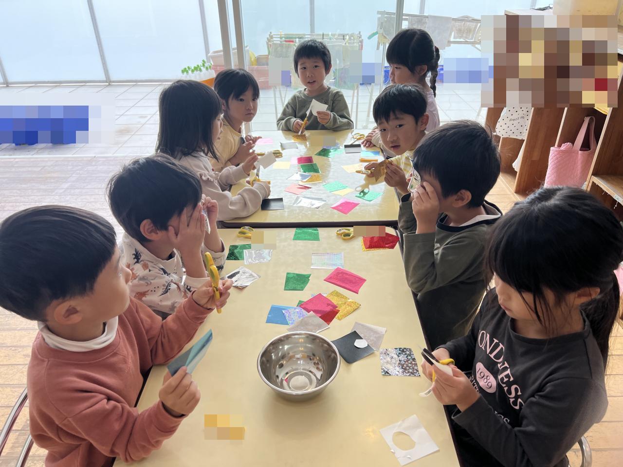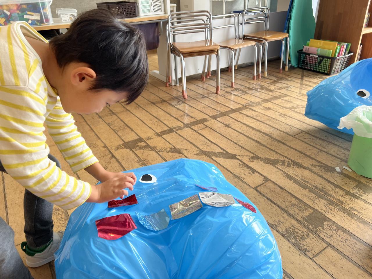 キラキラ折り紙でうろこを作り、貼っていきました🐠