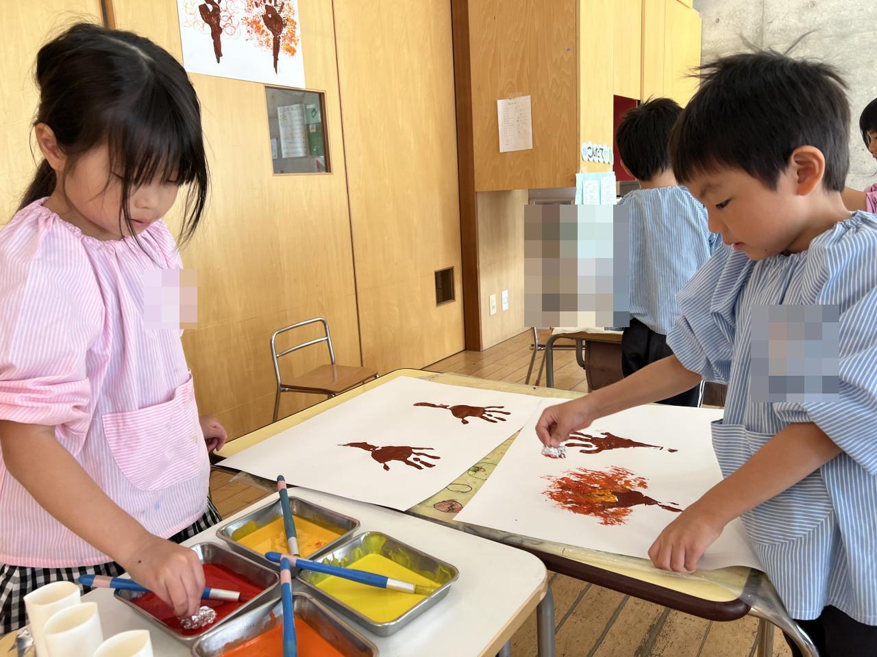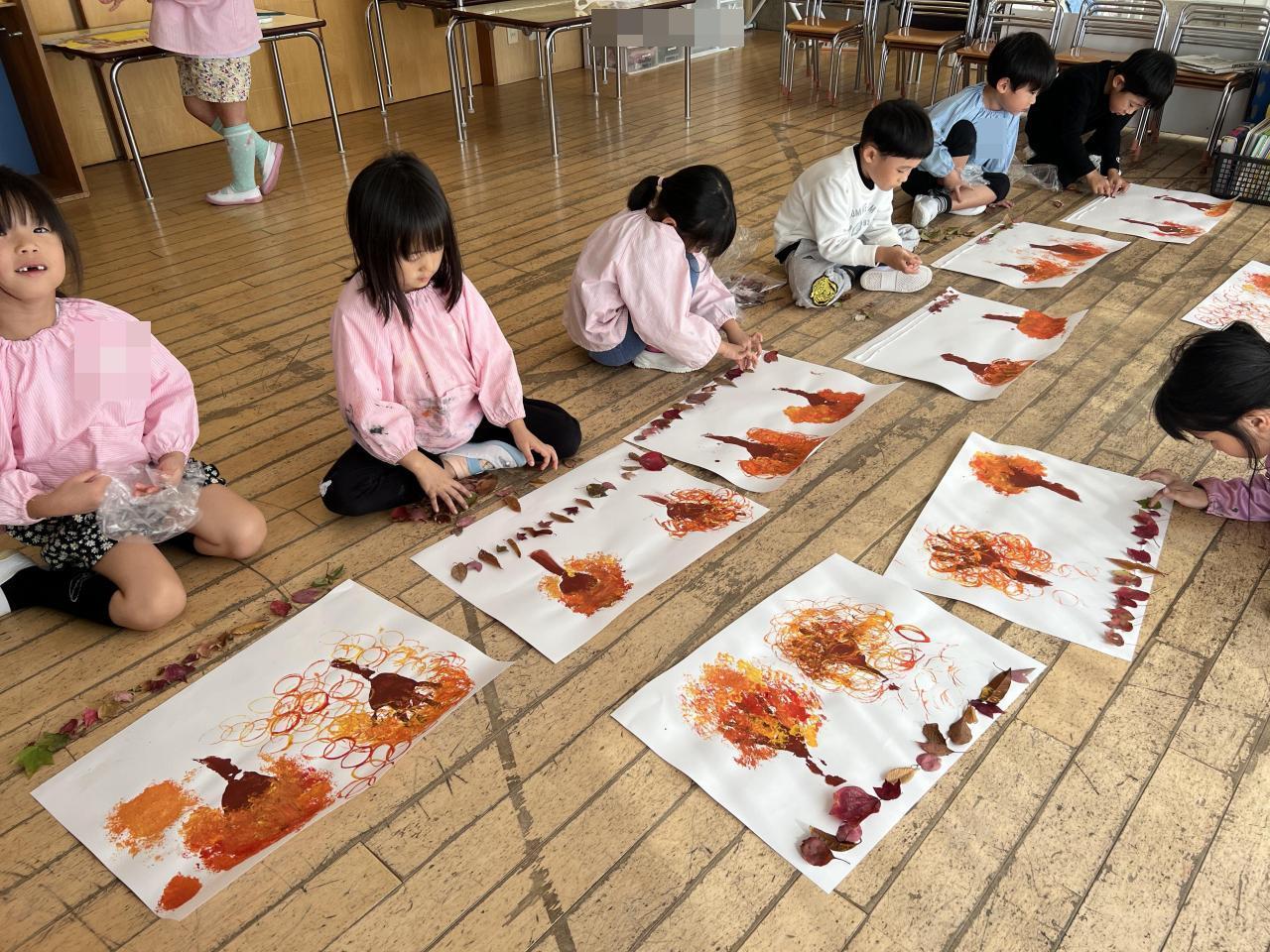 秋をイメージし、アルミホイルやトイレットペーパーの芯でタンポをしました!