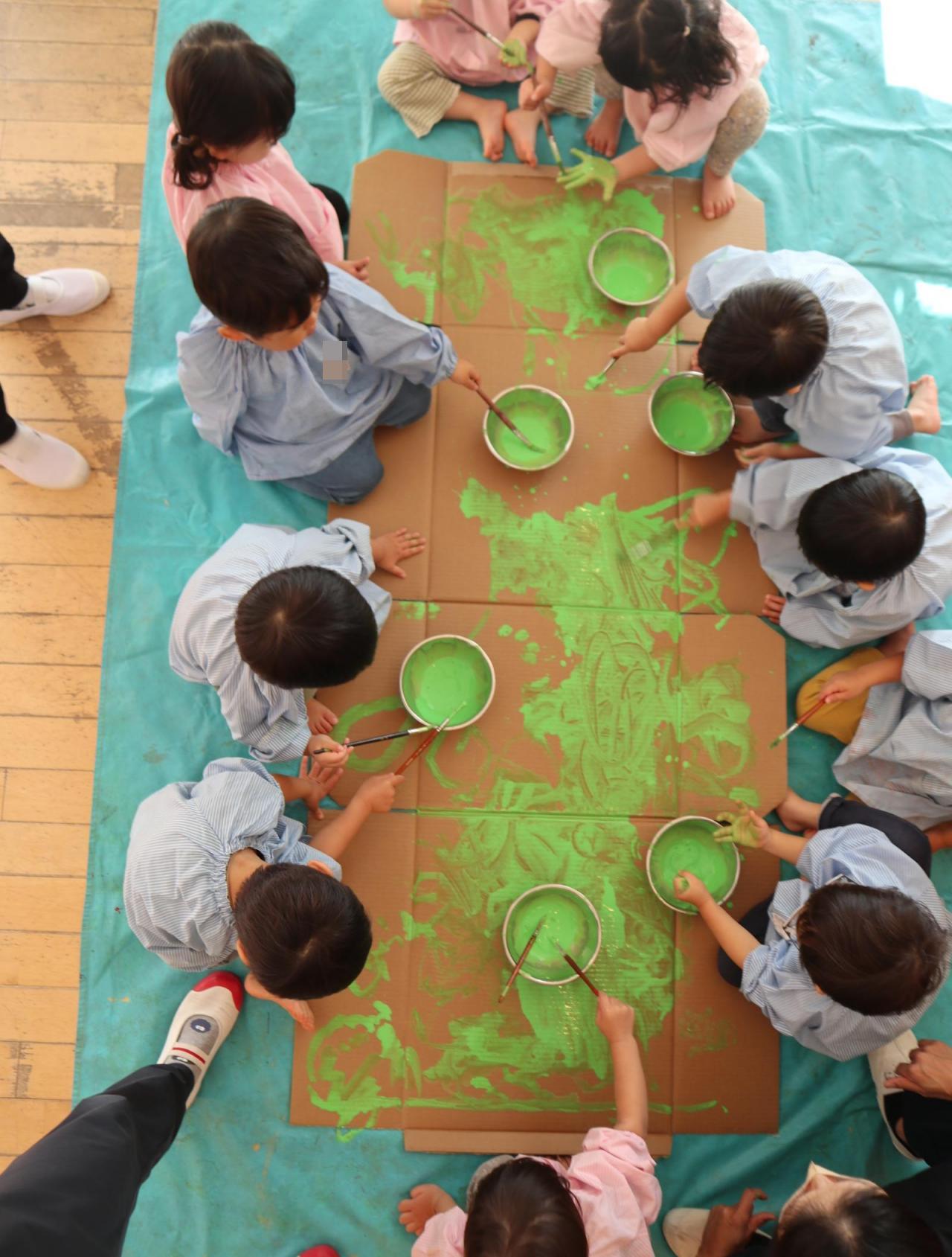 大きな段ボールを、全部カエル色になるまで塗りました!