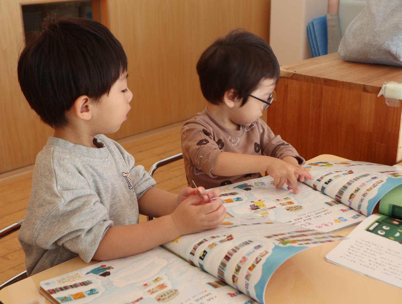 10月は、雲の上の図書館です!お友だちと一緒に「どこに貼ろうかな~?」と楽しそう😊