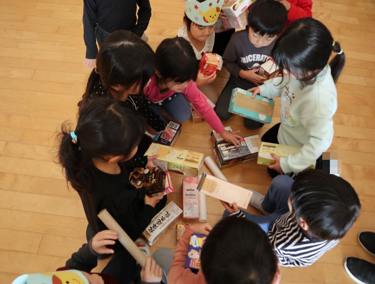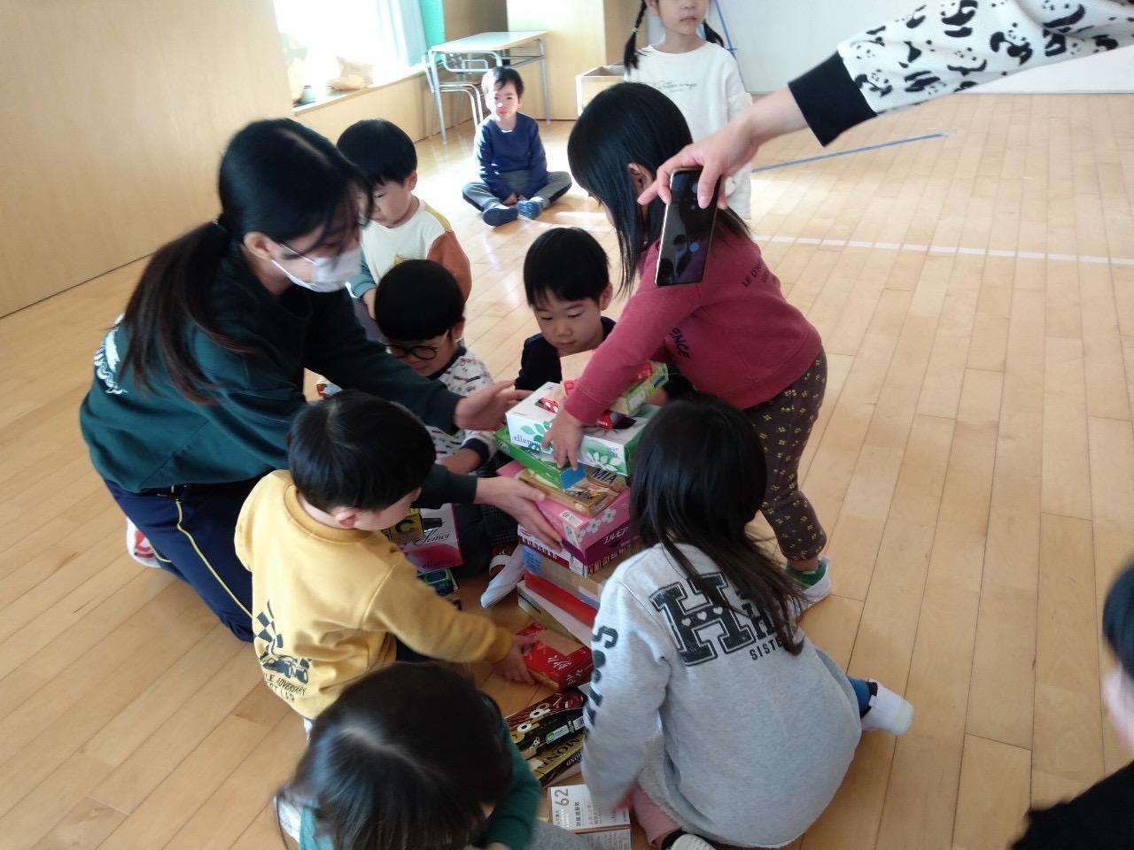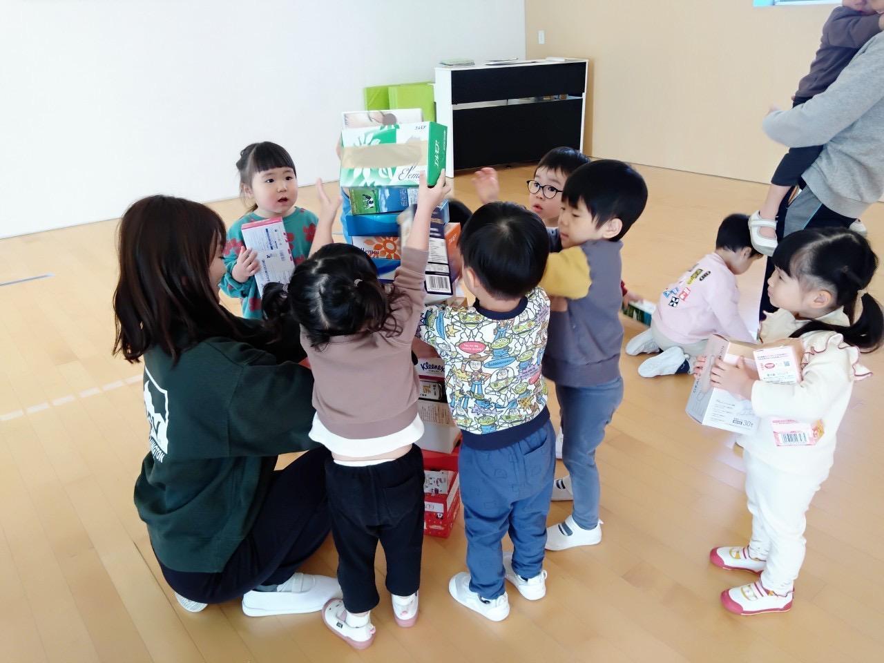 お友だちや先生とどうしたら箱が高く積めるか考えて話し合いながら高く積み上げることが出来ていましたよ!