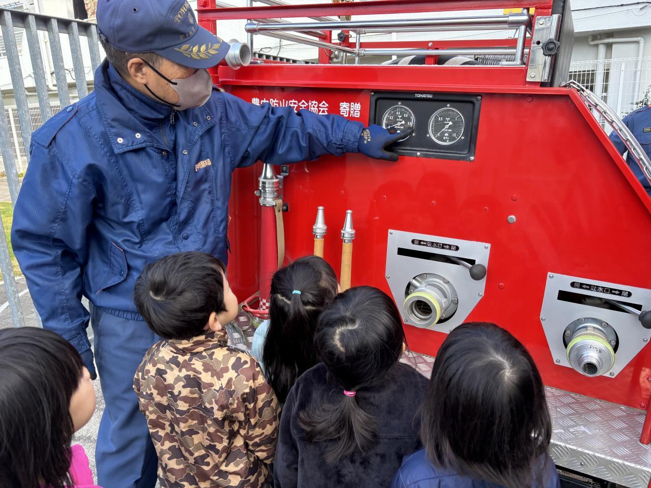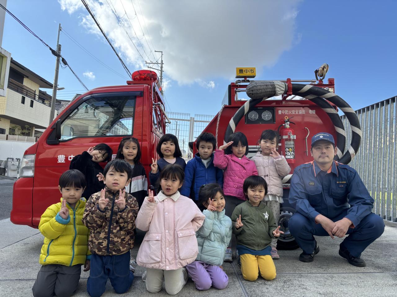 火災を想定して実際に避難訓練を行い、園庭で消火の実践訓練を見たり、消防士さんから避難の方法を教えてもらいました😌