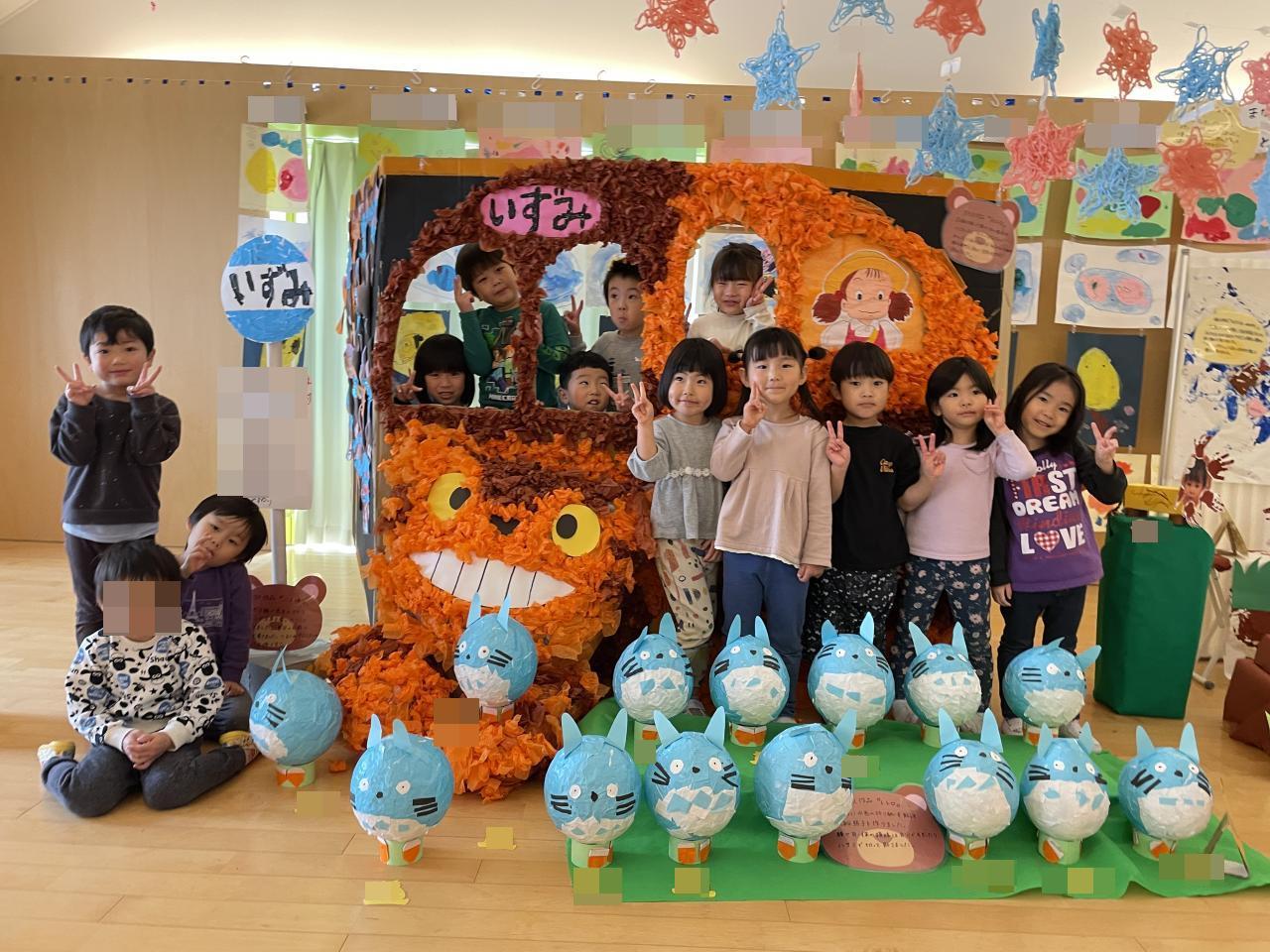 くまぐみはオレンジと水色でトトロの世界を表現しました🍀作品展当日はお家の人に自分たちの作品を見てもらい、嬉しそうな様子でしたよ💓