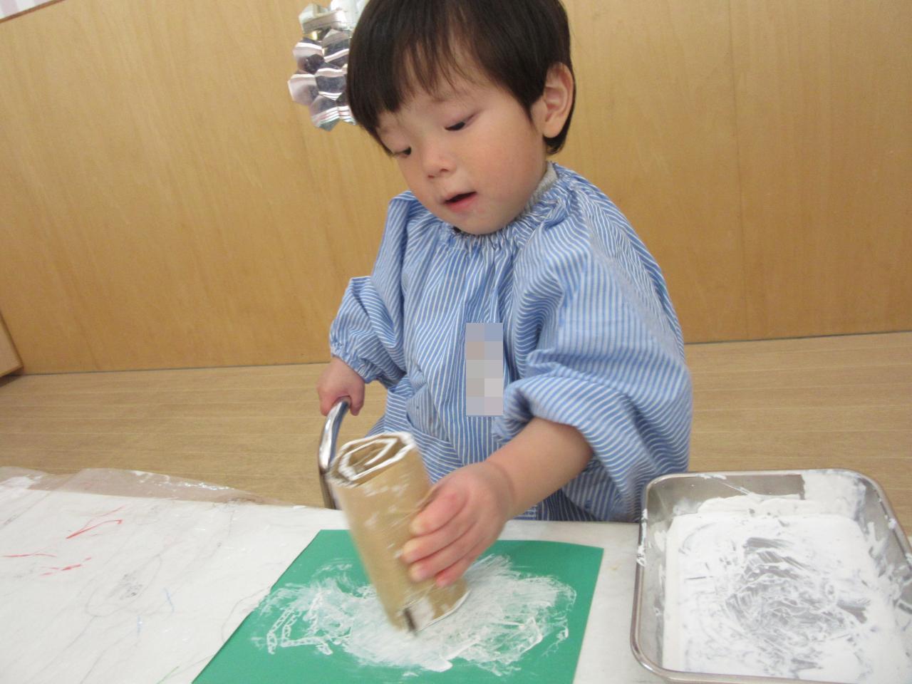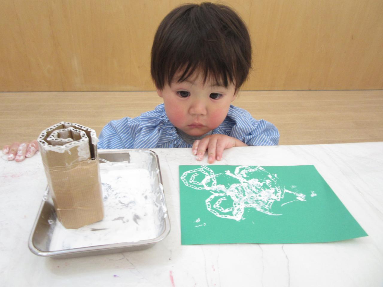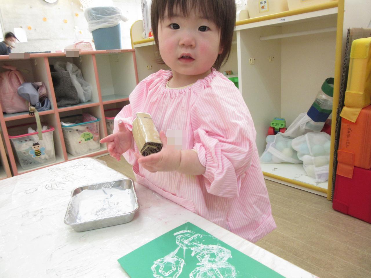 緑色の画用紙に白色の絵の具でたくさんスタンプをして獅子舞を作りました✨