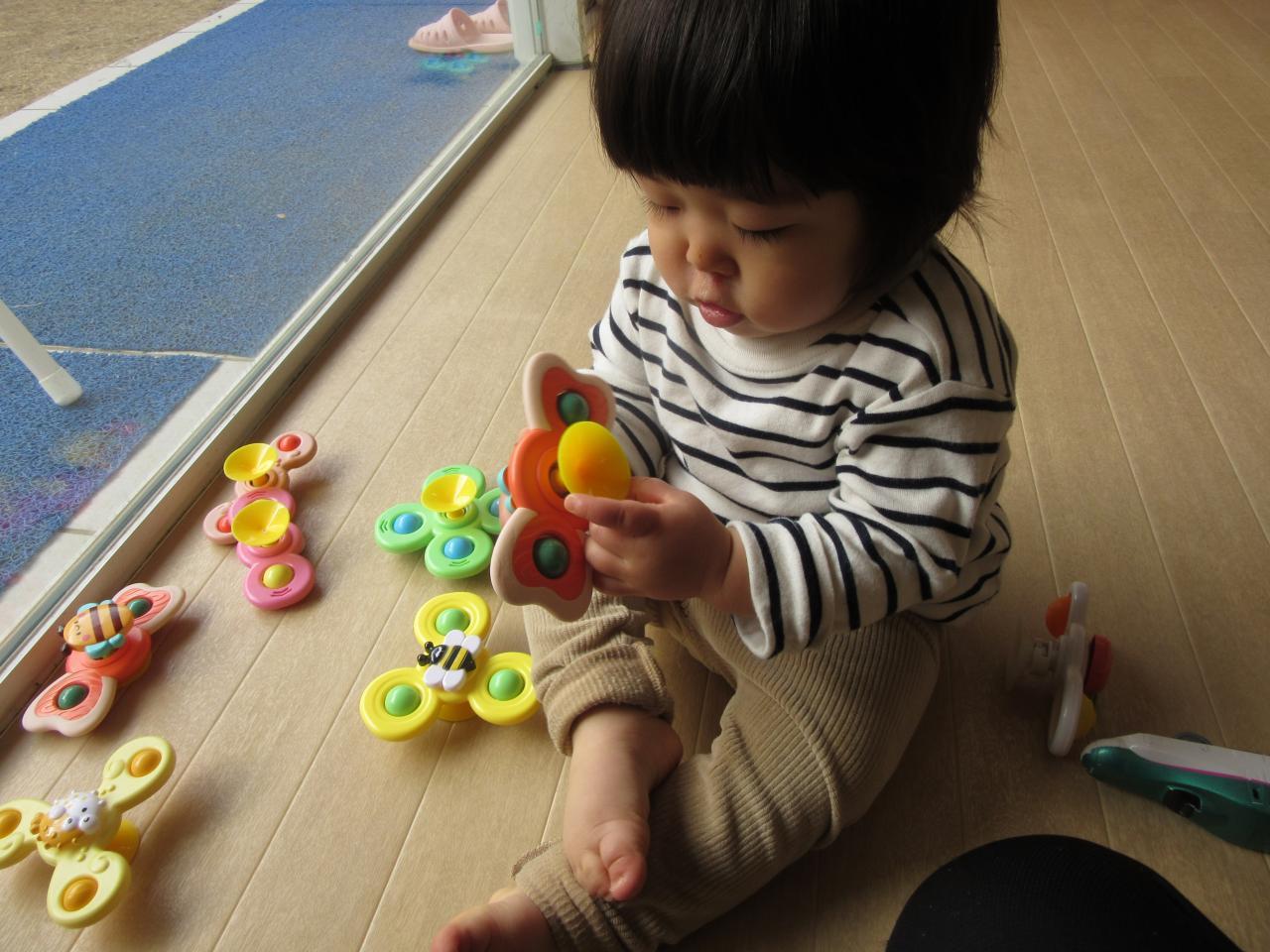 ハンドスピナーのおもちゃを窓に貼ると夢中でクルクル回して遊びました🤭