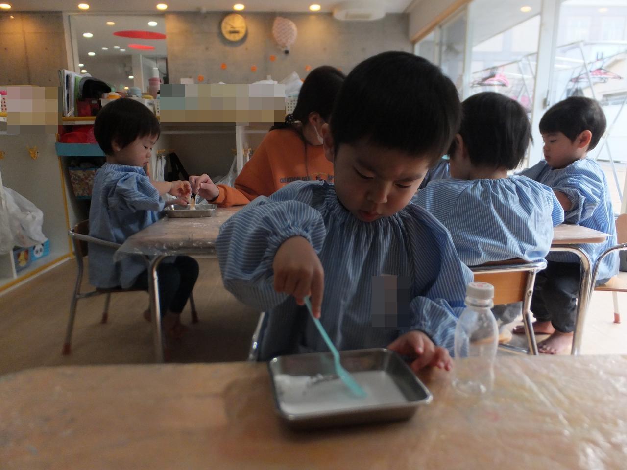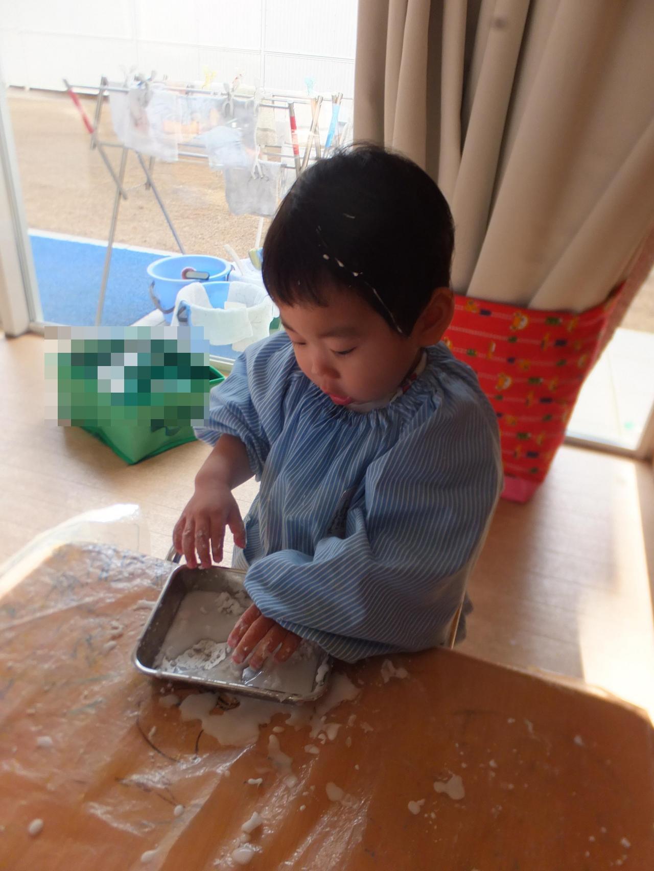 片栗粉やスライムを触ったり、スプーンですくったりして感触を楽しみました。