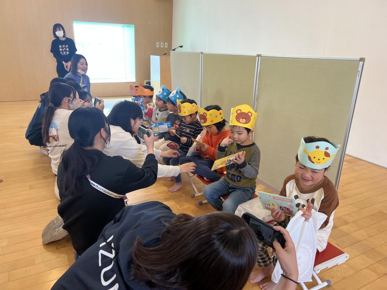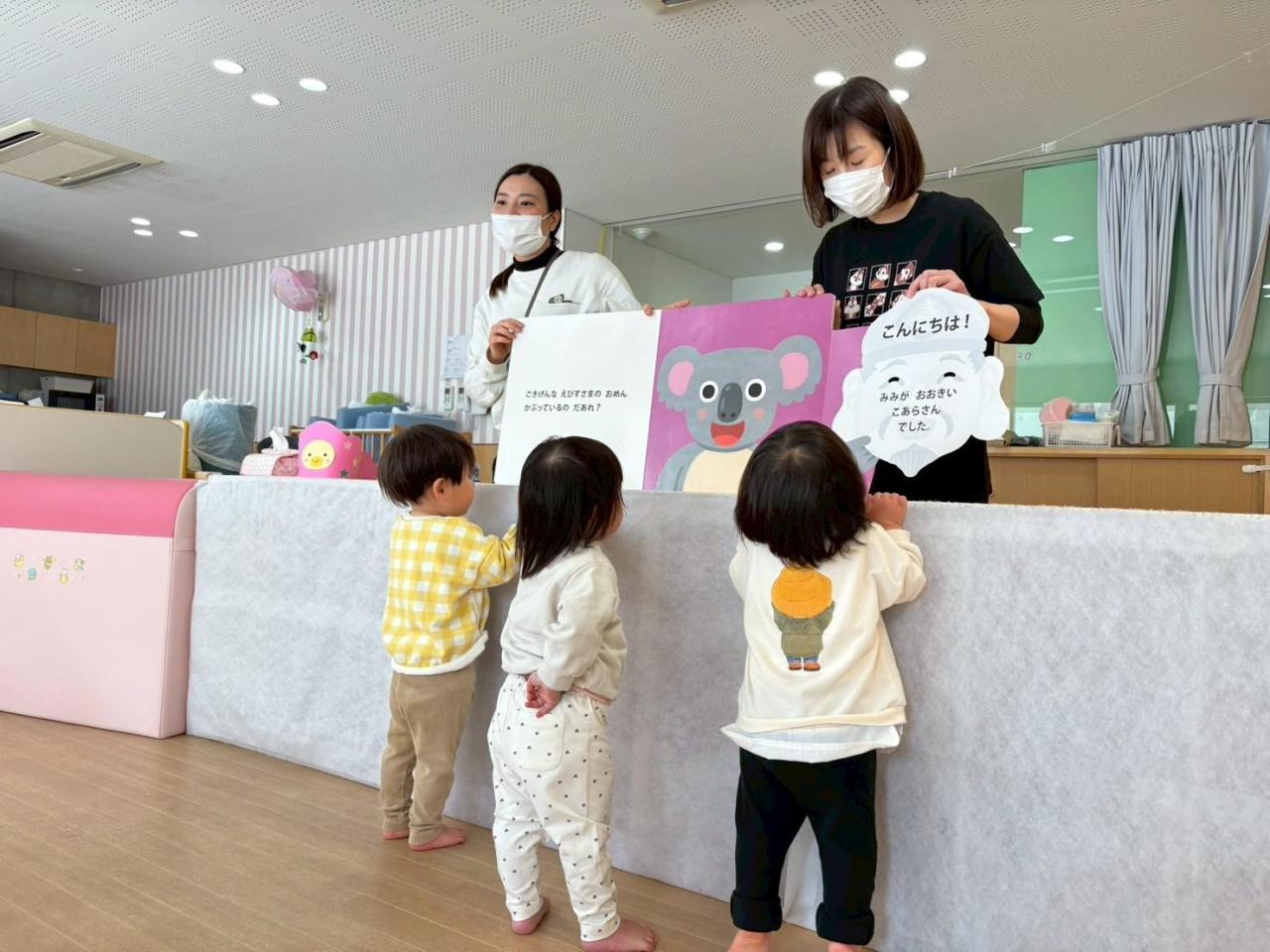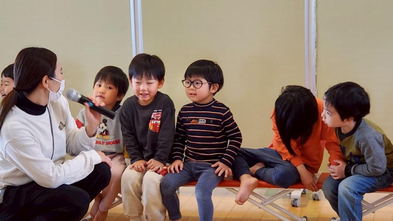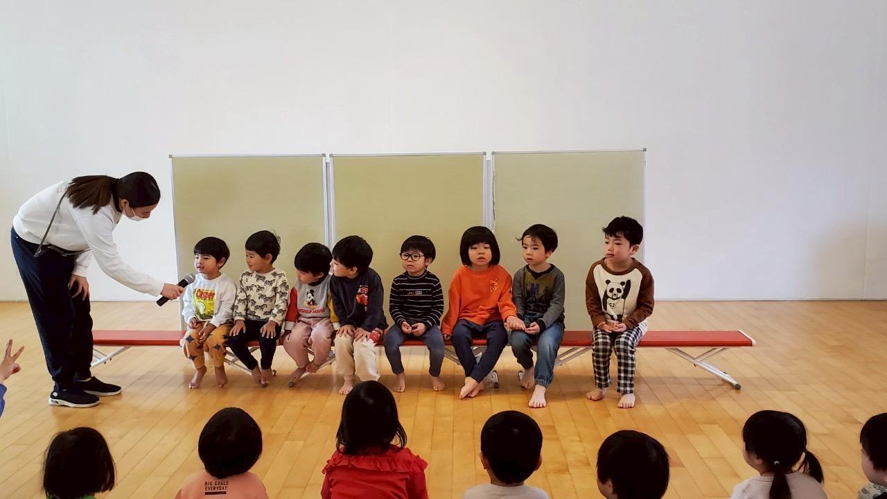 先生からの出し物は大型絵本「おめんです3」とおめんの中はだれでしょうクイズをしました😆