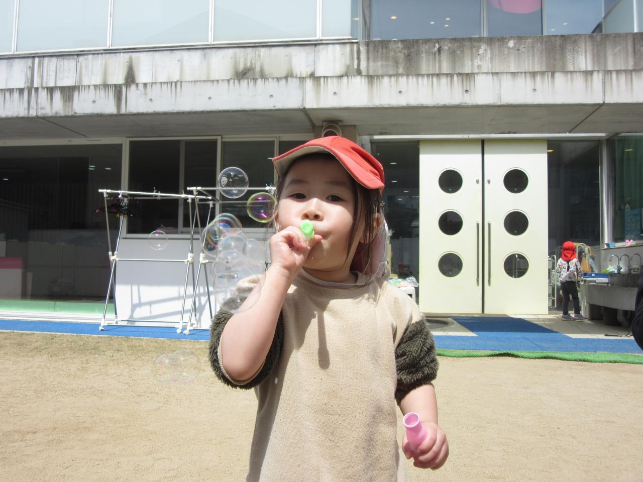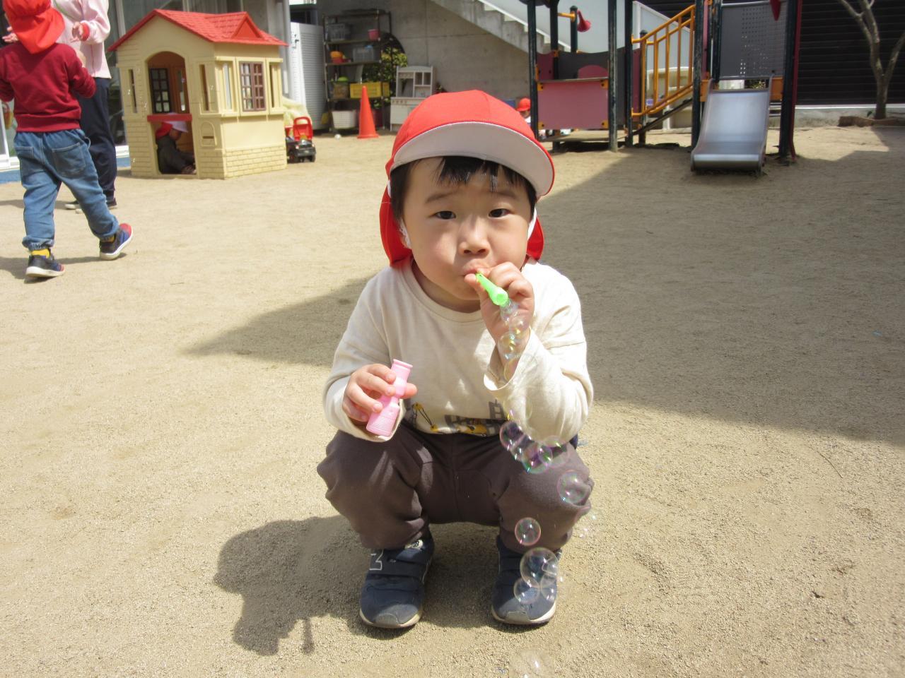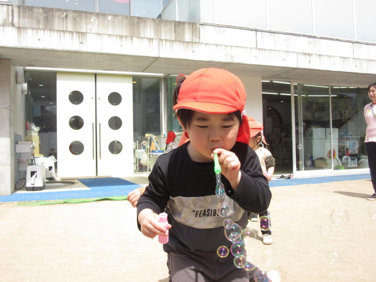 他のクラスのお友だちがシャボン玉で遊んでいると跳んでいるシャボン玉を追いかけたり、一緒に遊んで楽しみました🙌