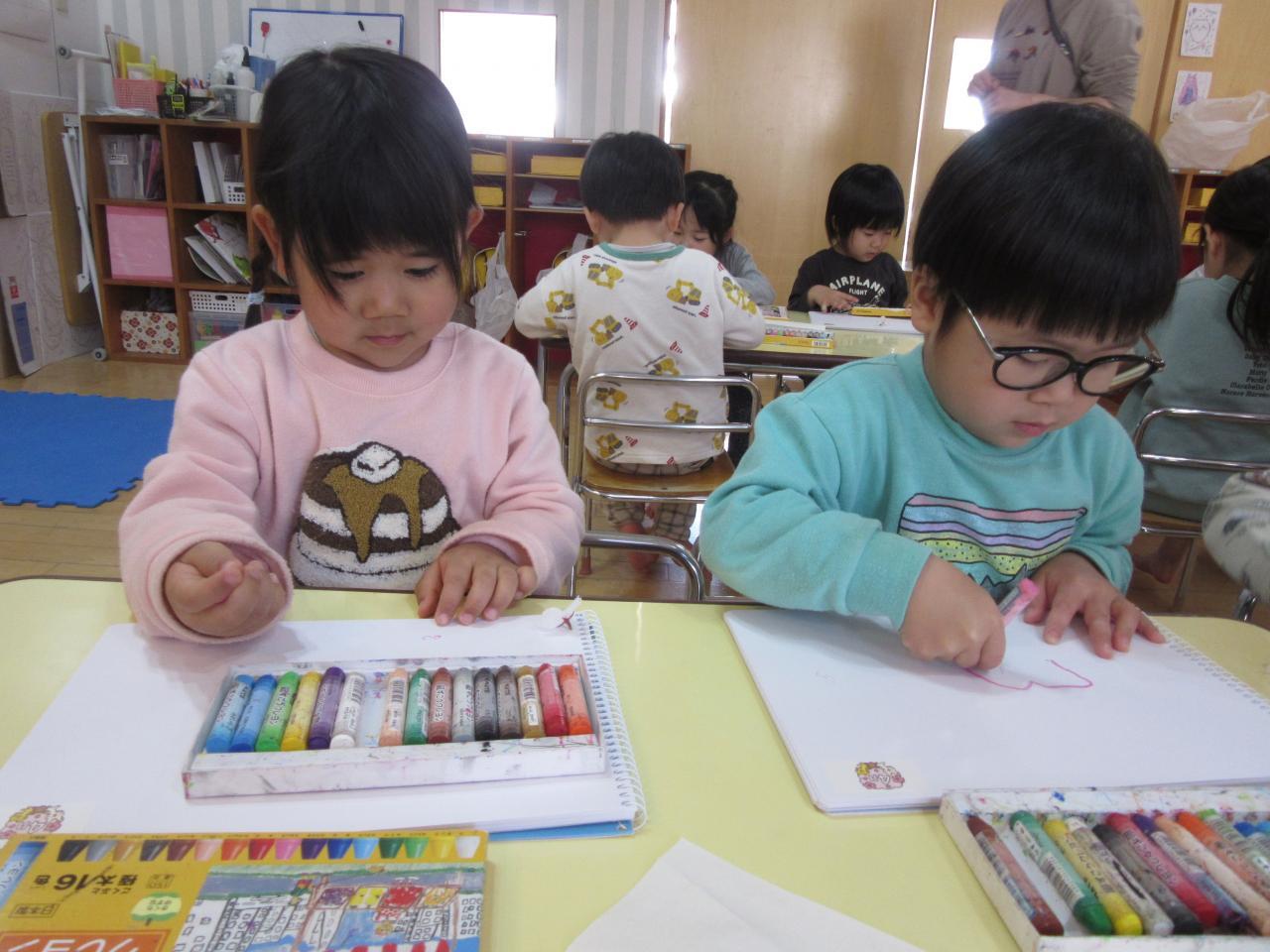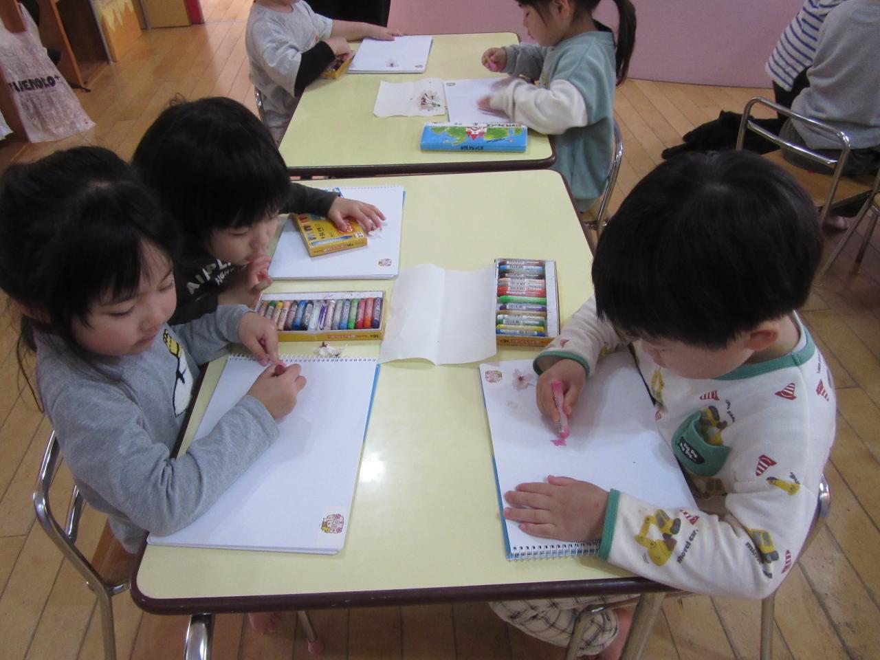 公園で集めた桜を見ながら自由画帳にクレヨンで桜を描きました☺