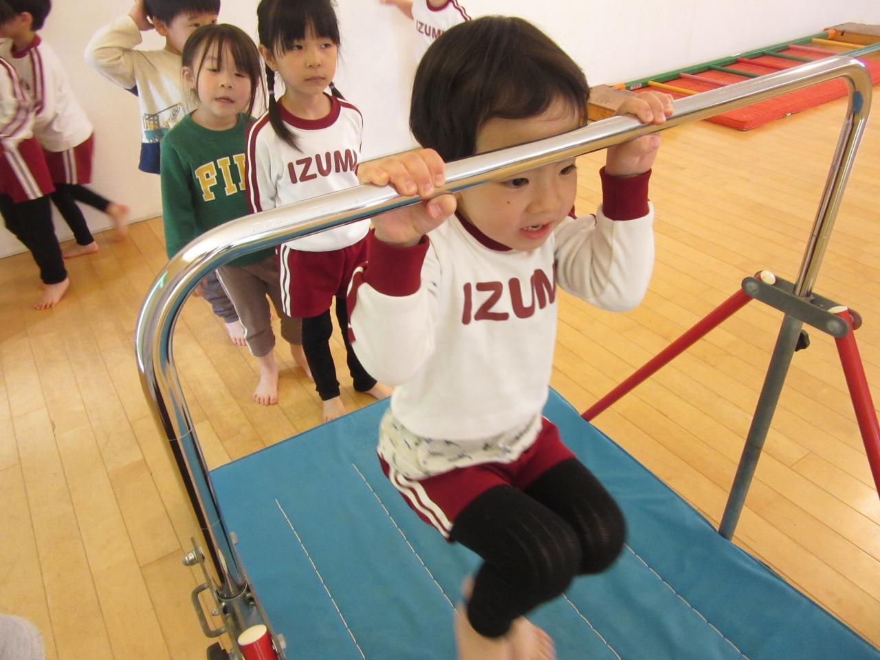 鉄棒におでこを付けてぶら下がる事や先生と一緒に前回りをするなど出来ることがだんだん増えています😝