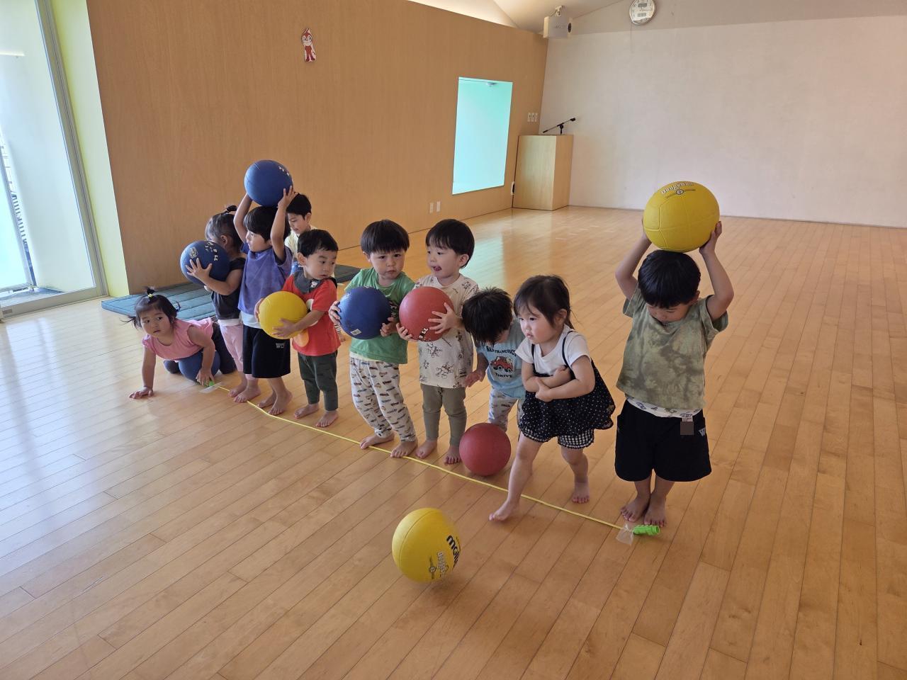 ホールあそびが大好き!初めての電車ごっこやボールで的当てをしました😀