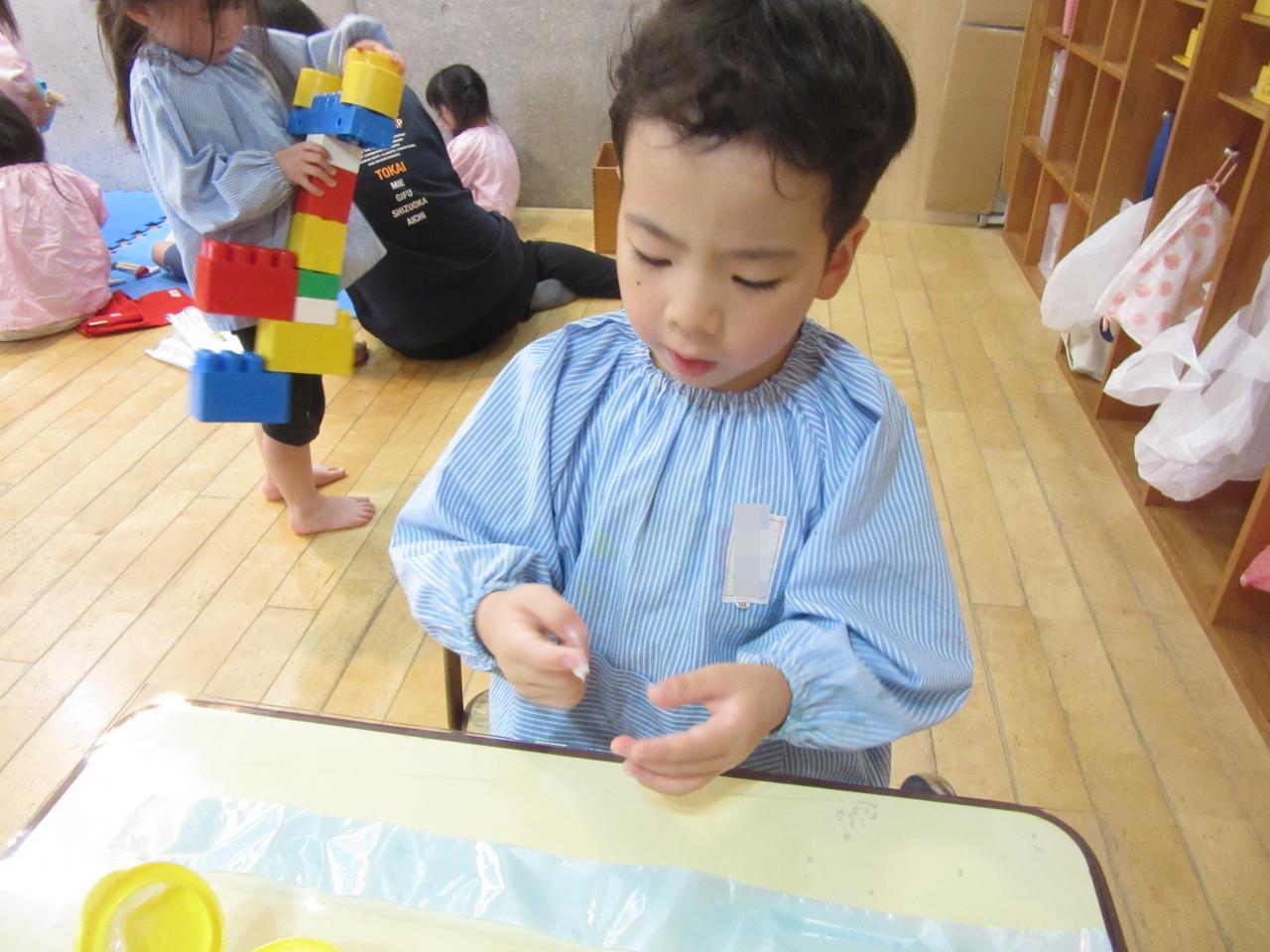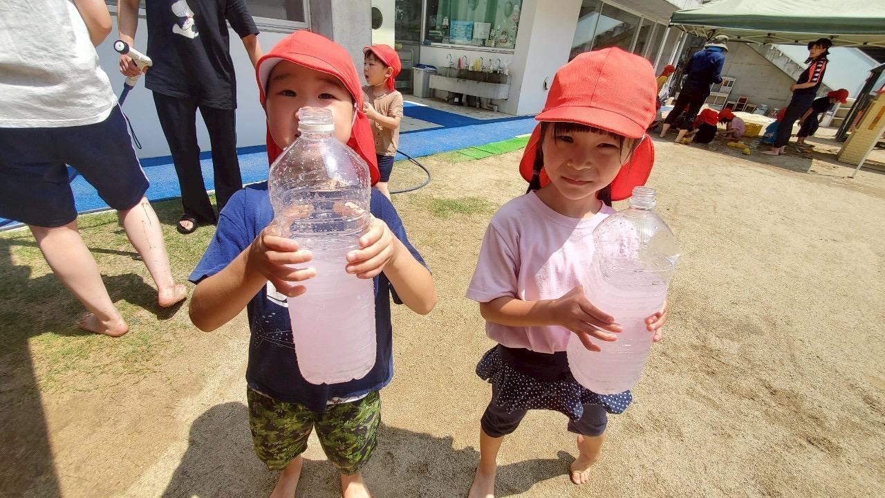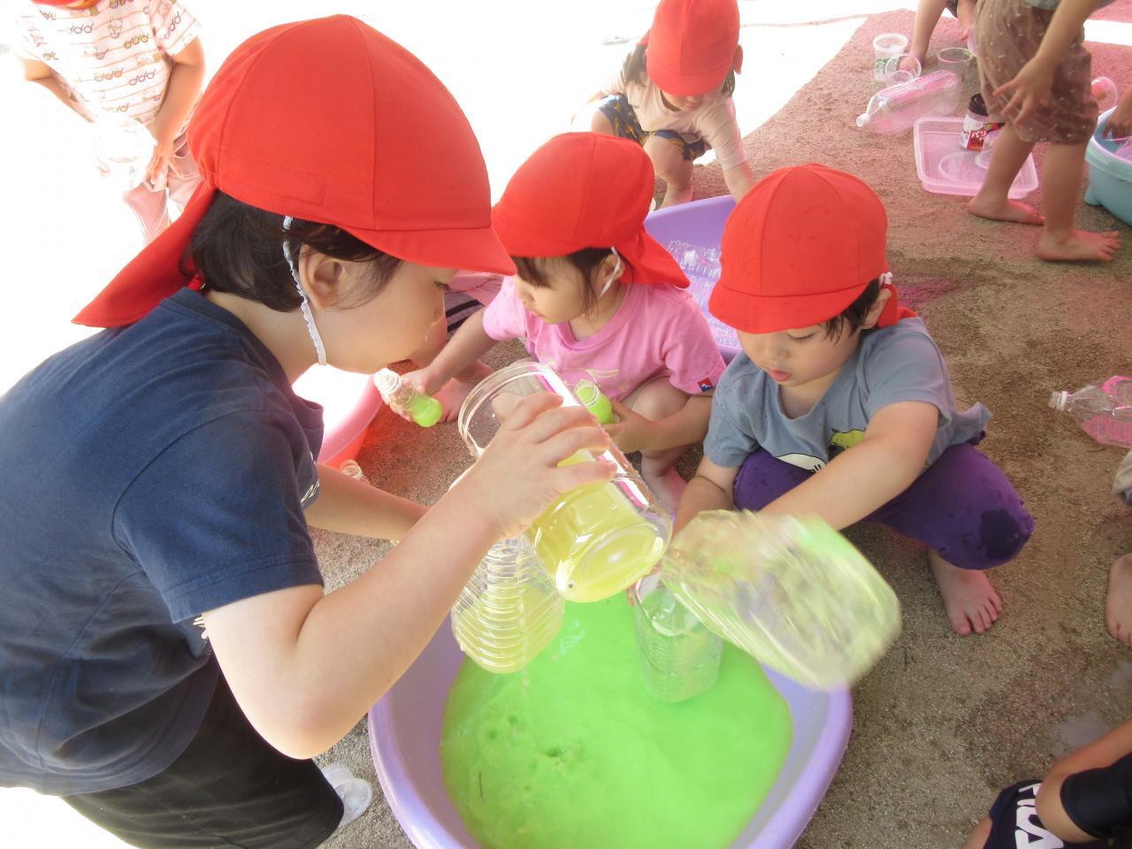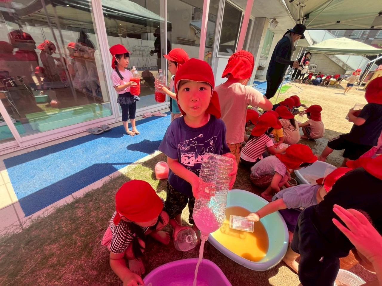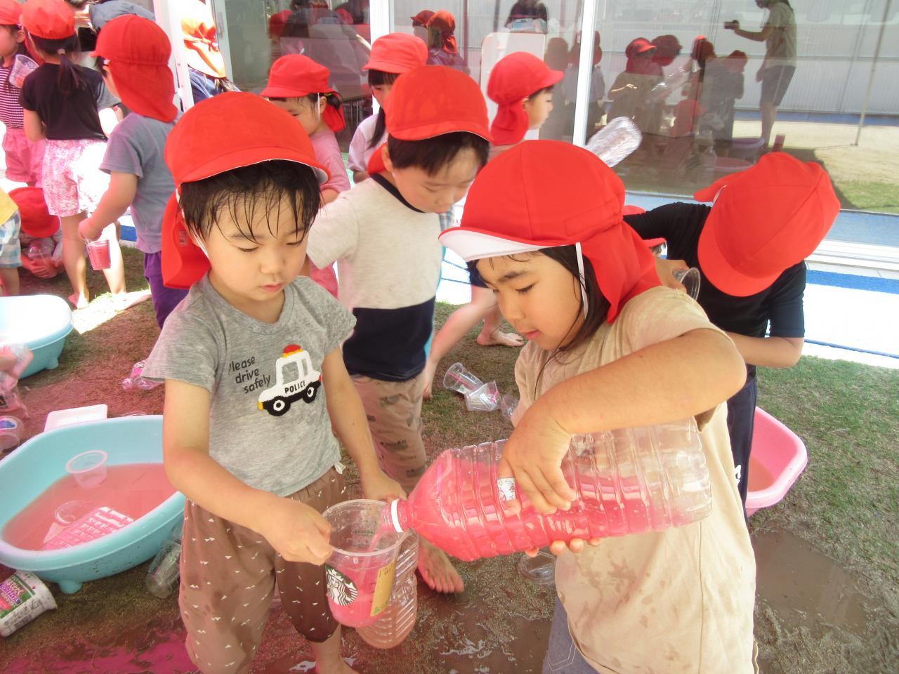 色水あそびと泥あそびがありましたがくま組はみんな色水あそびを夢中に楽しんでいる子どもたちでした。