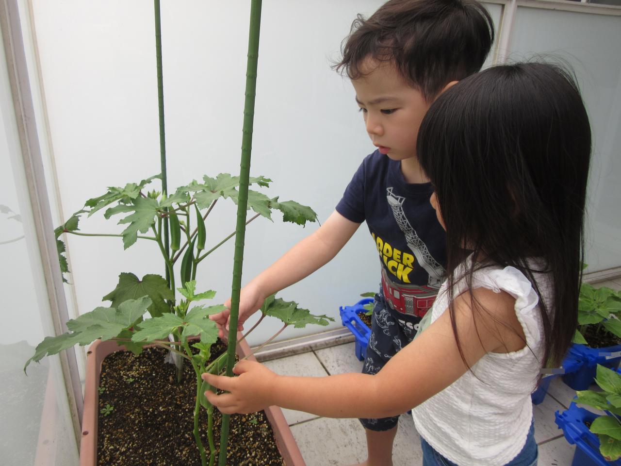 毎日子どもたちが欠かさず水やりを行ってくれているのでオクラやミニひまわりがとても大きくなりましたよ☺