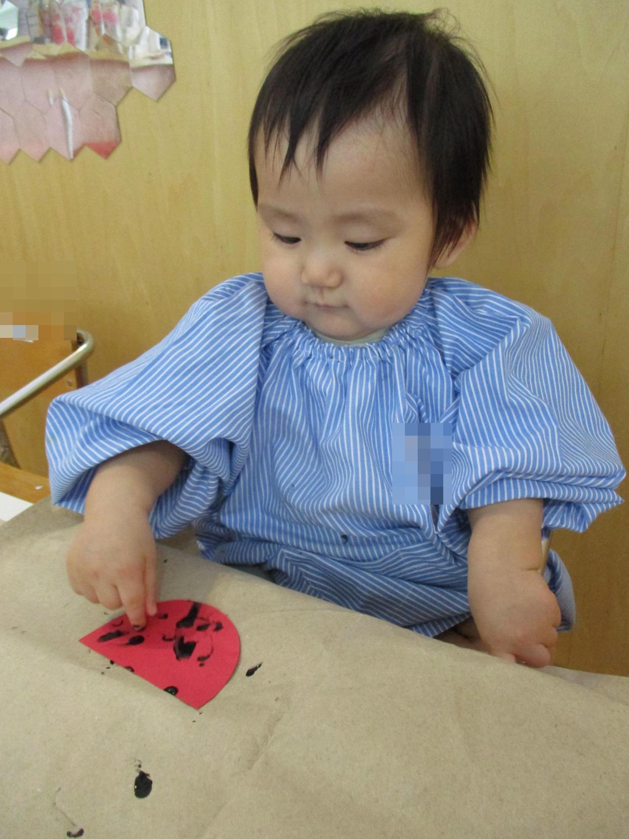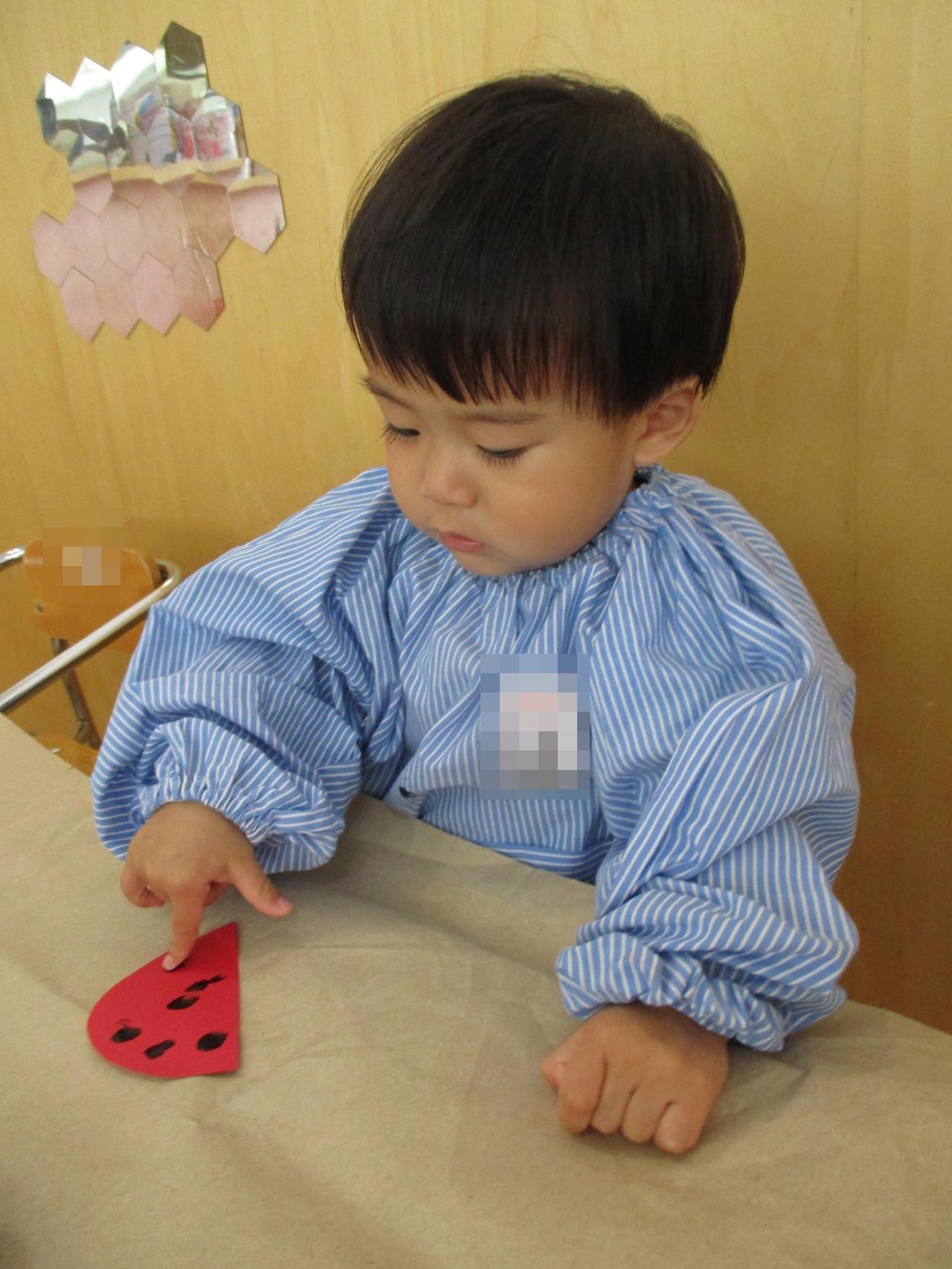 指に絵の具を付けて、スイカの種を表現しました🍉