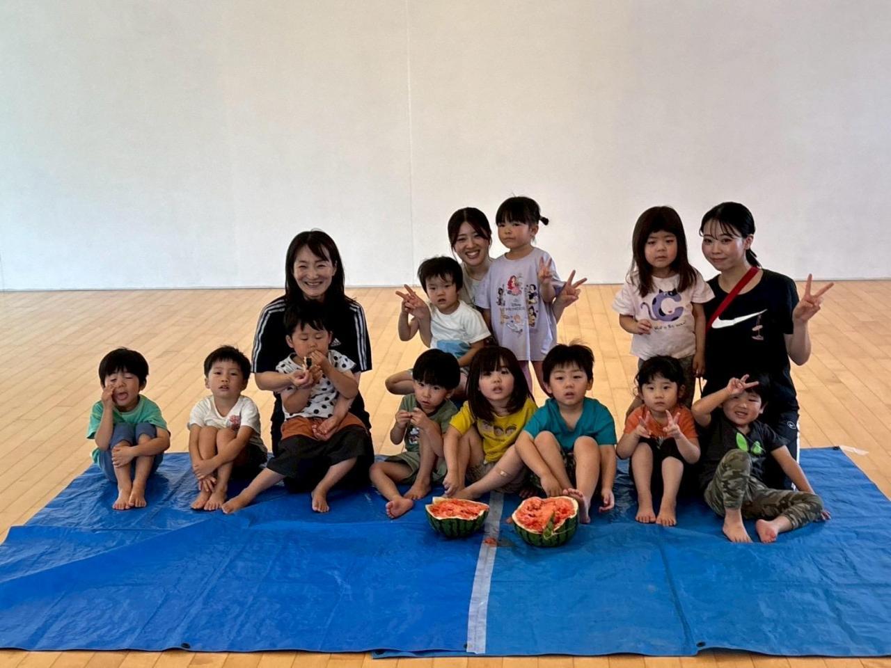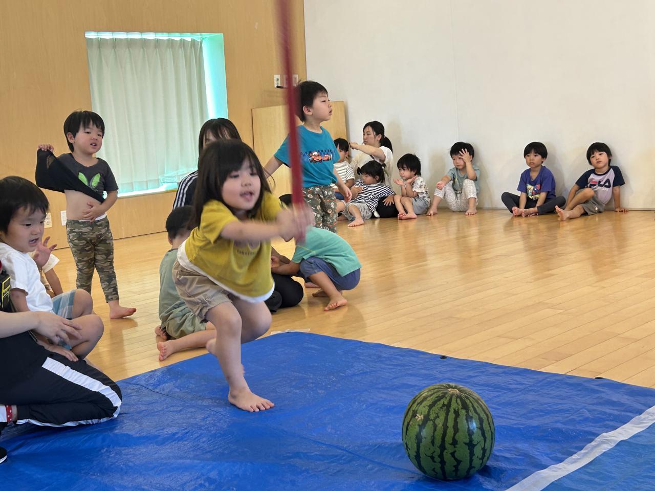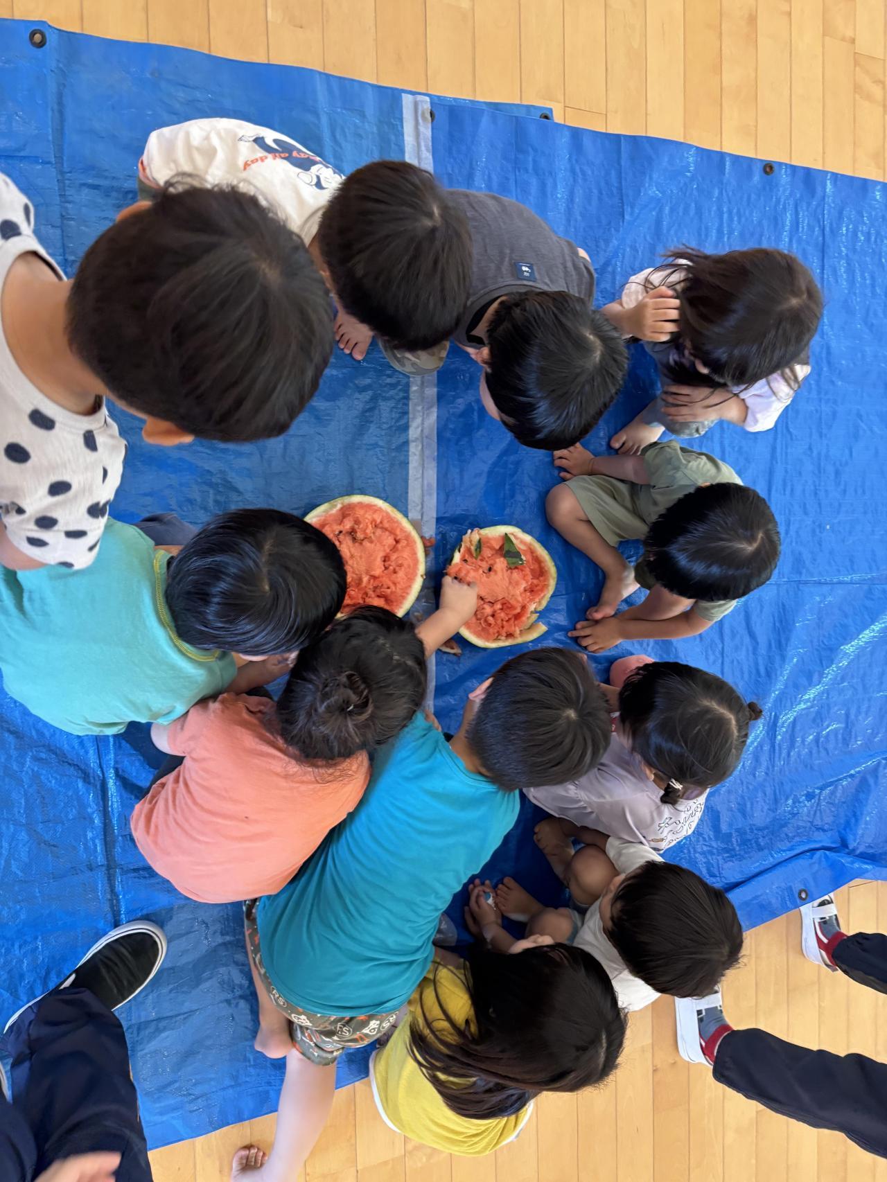 とっても大きなスイカをみんなで力を合わせて割るのですが、、、なんといってもこの大きさ!硬さ!子どもたちが何度も何度も叩きますがなかなか割ることが出来ず、最後は園長先生が全力で真っ二つに割ってくれました🤭