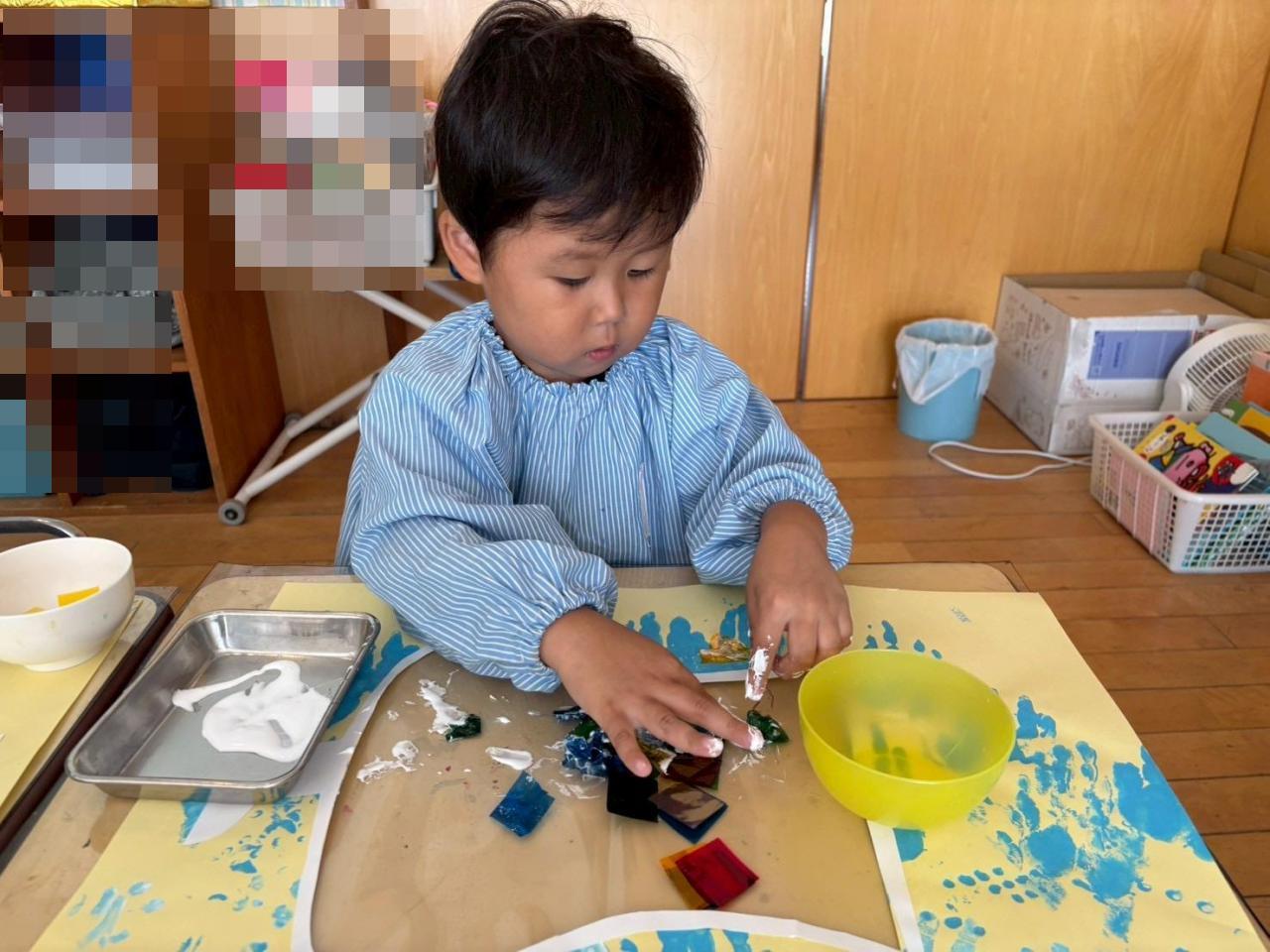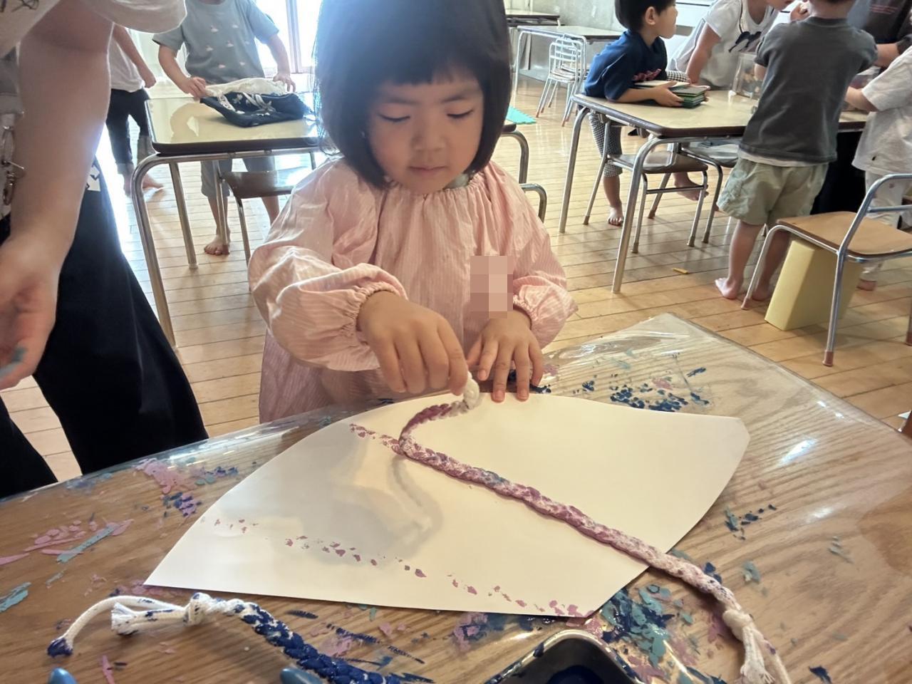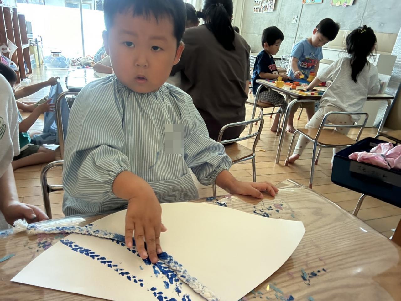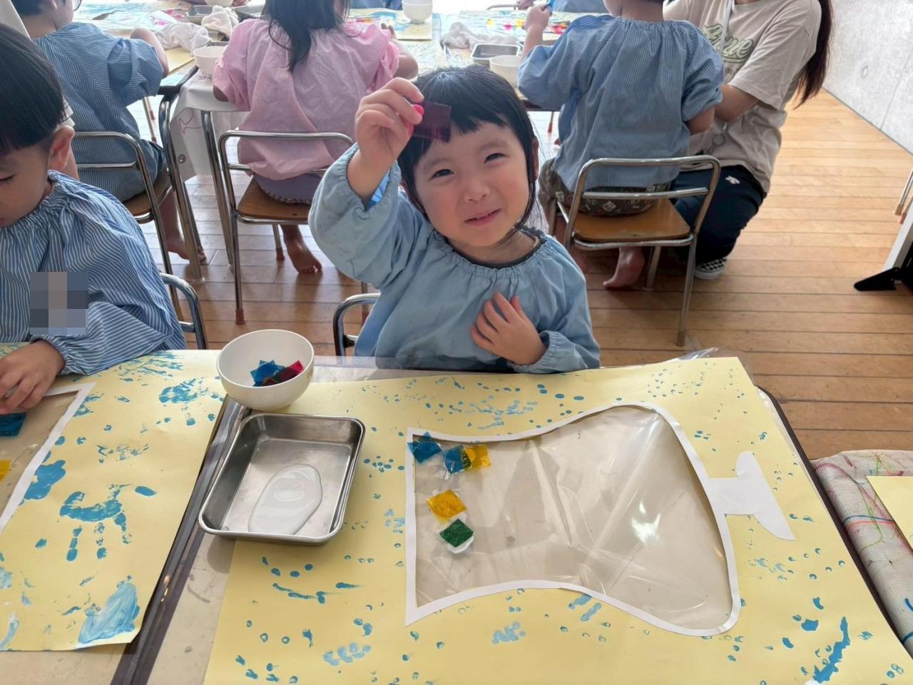 紐を使ってスタンプをしたり、ボンドを使ってカラーセロハンを貼ったりと、細かい作業にも挑戦しました🤩
