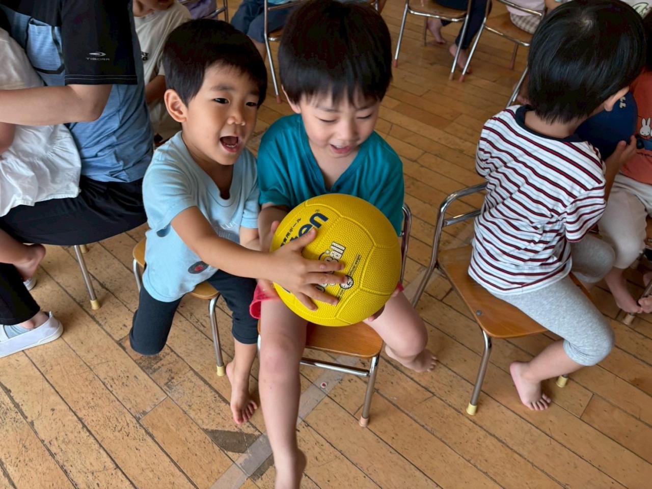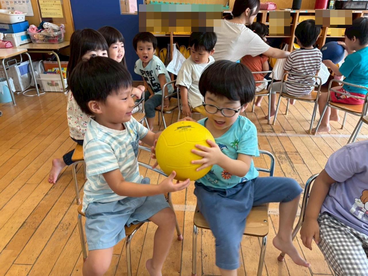 ボールを爆弾に見立てて、隣に座っているお友だちに慎重に渡します💣😳
