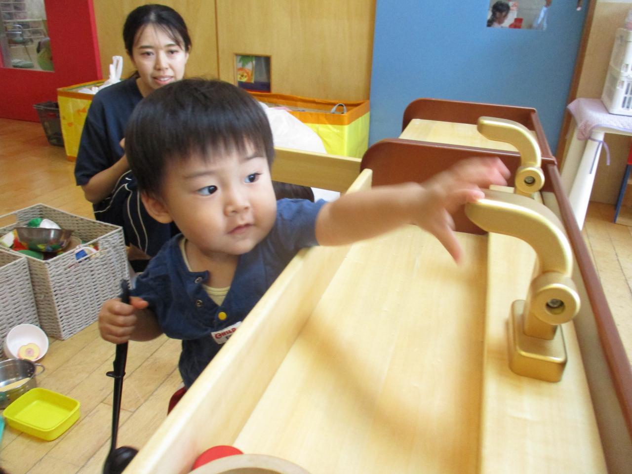 1階ままごとと異なり、様々な食べ物や道具があるので、興味津々👀