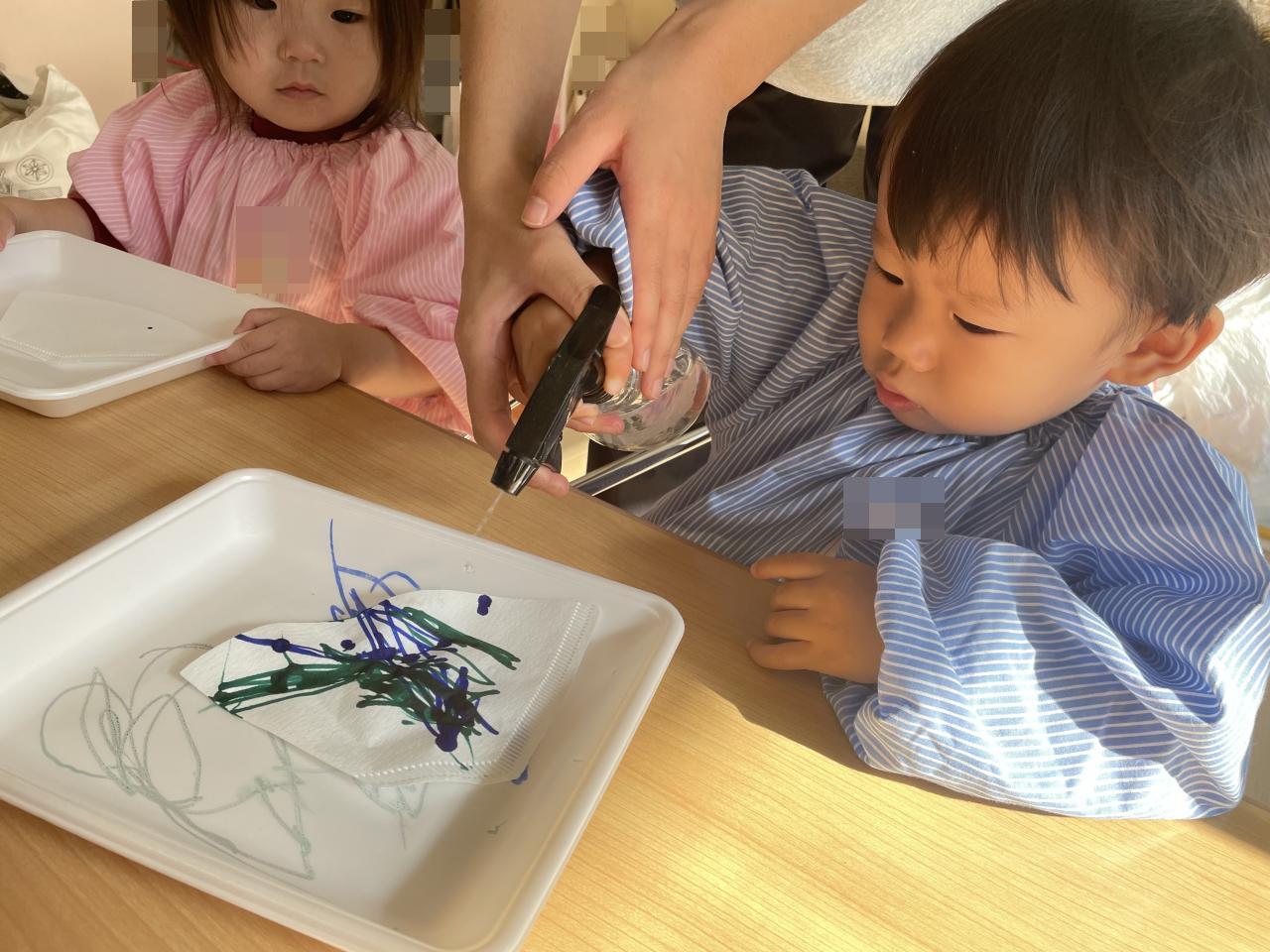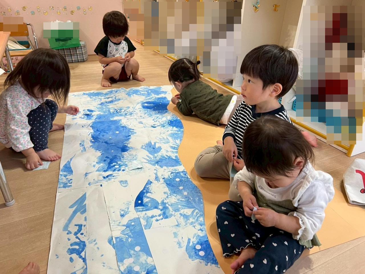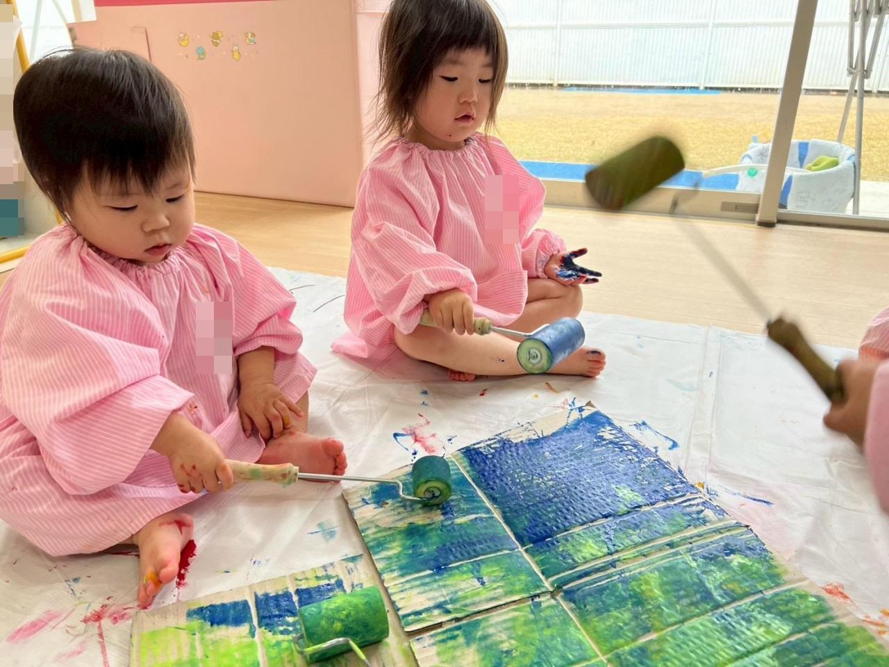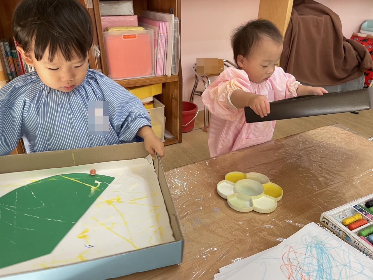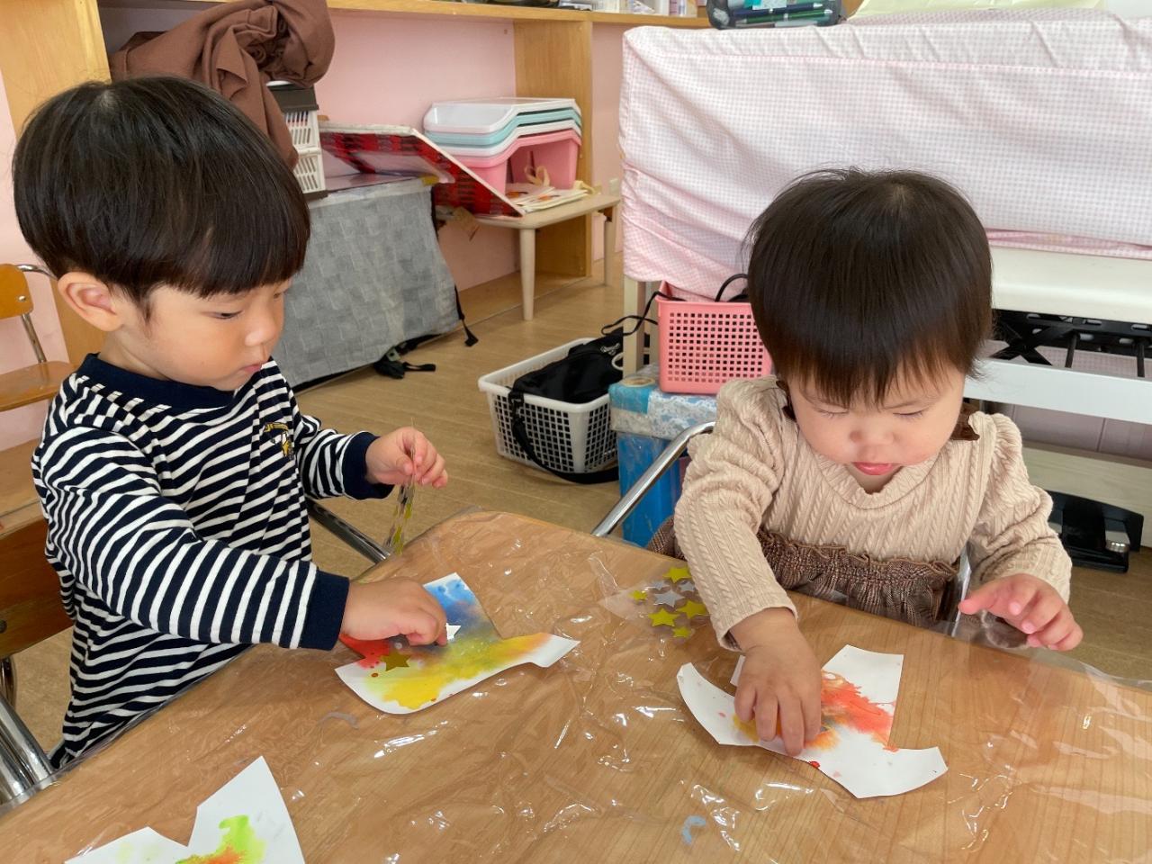 作品展で飾る作品をたくさん作ったり、クリスマス帽子を作ったりしましたよ🌟ローラーやビー玉、霧吹きなどたくさんの道具を使って製作あそびを楽しんでいるりすぐみです😊
