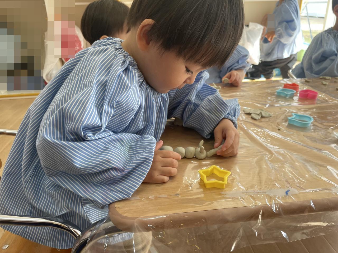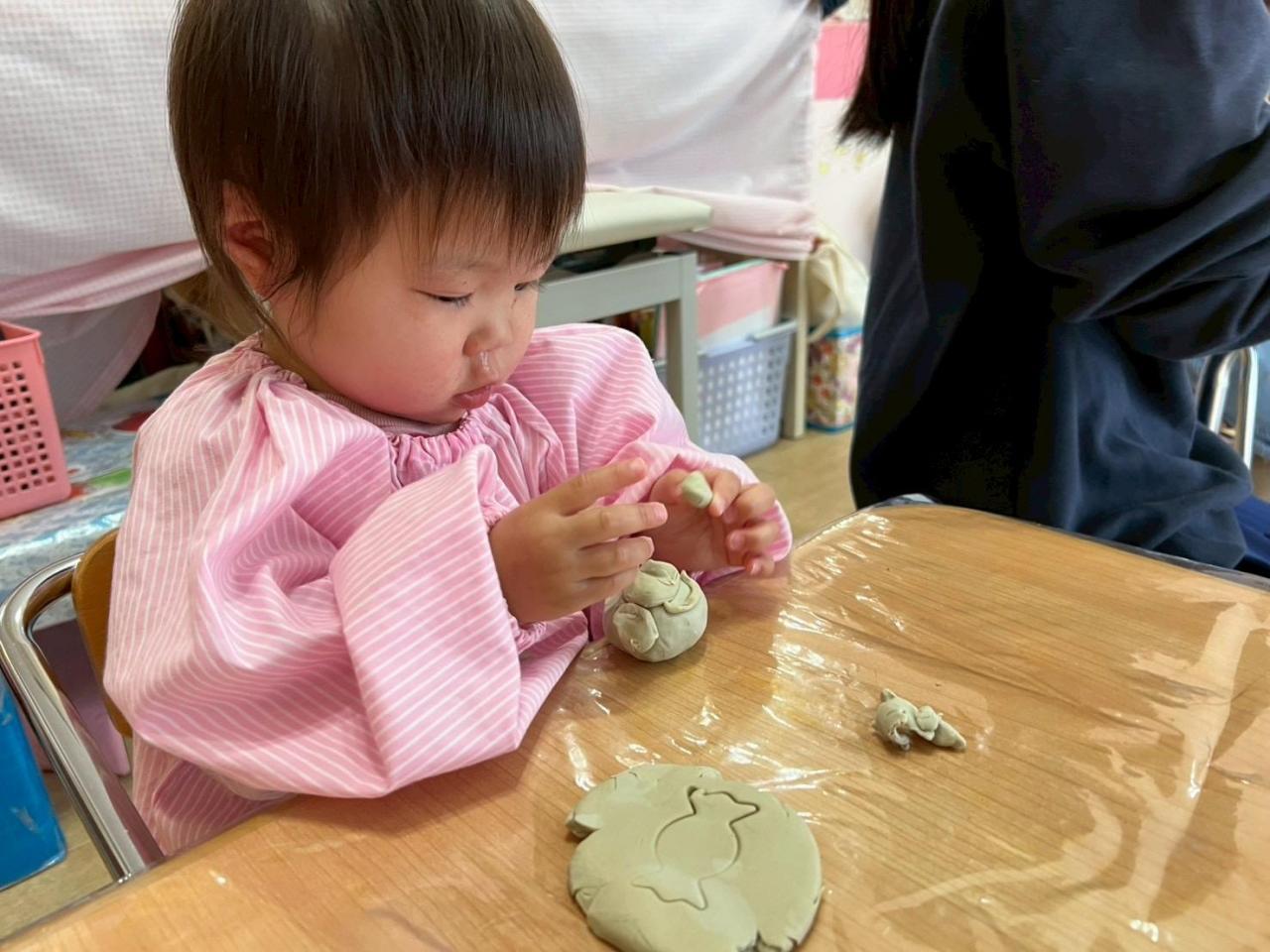 園では初めての油粘土で遊びました!先生が見本でこねたり、丸めたりすると「やりたい!」と興味津々な子どもたちでした😆
