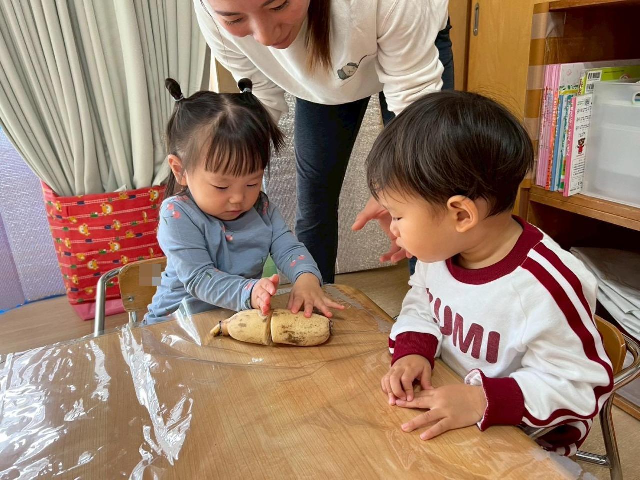 触り心地や匂いなど、じっくり観察していましたよ🔍穴がたくさん空いているのを見て不思議そうにしたり興味津々な様子でした✨