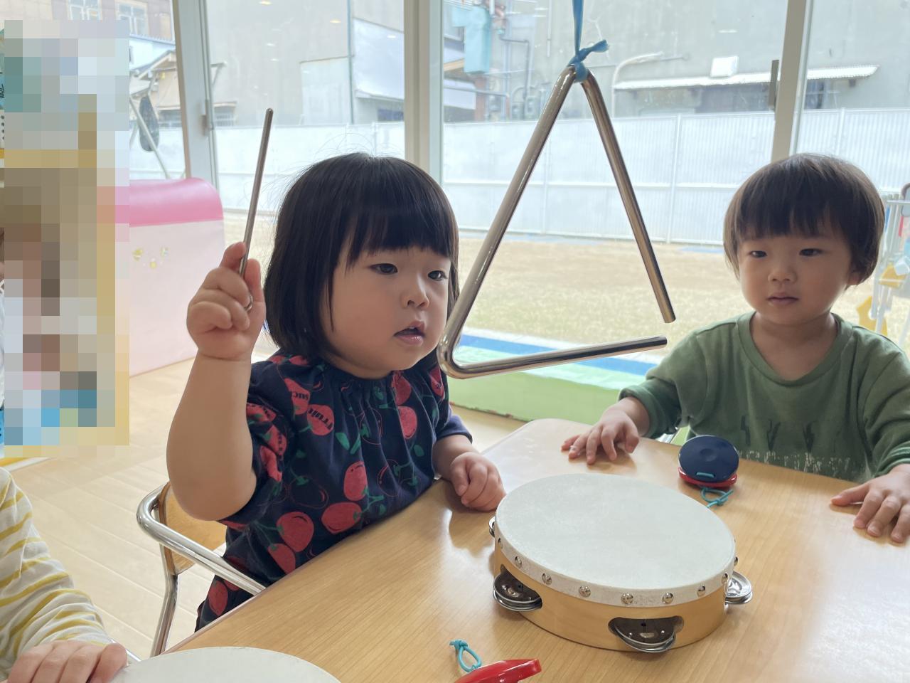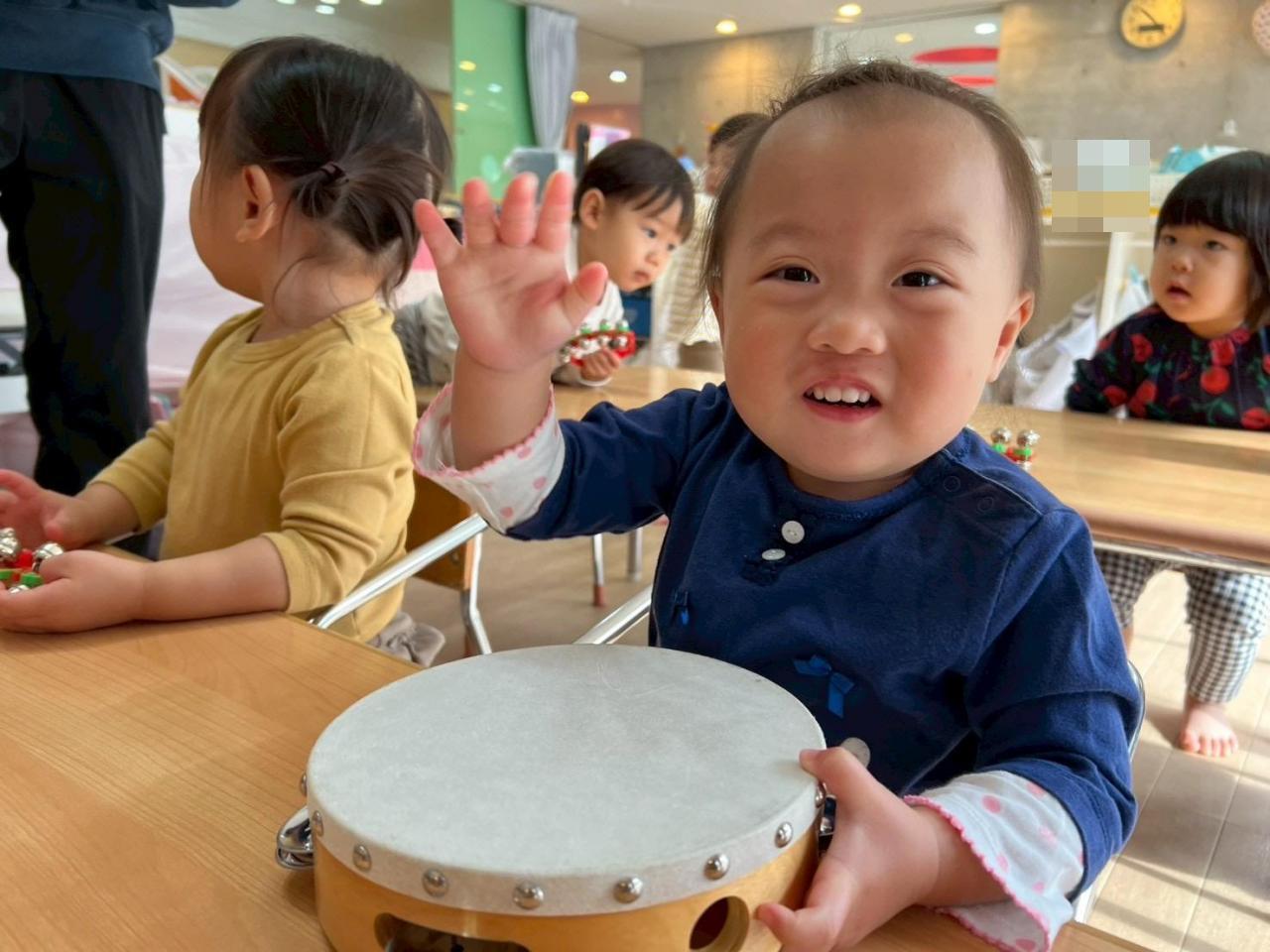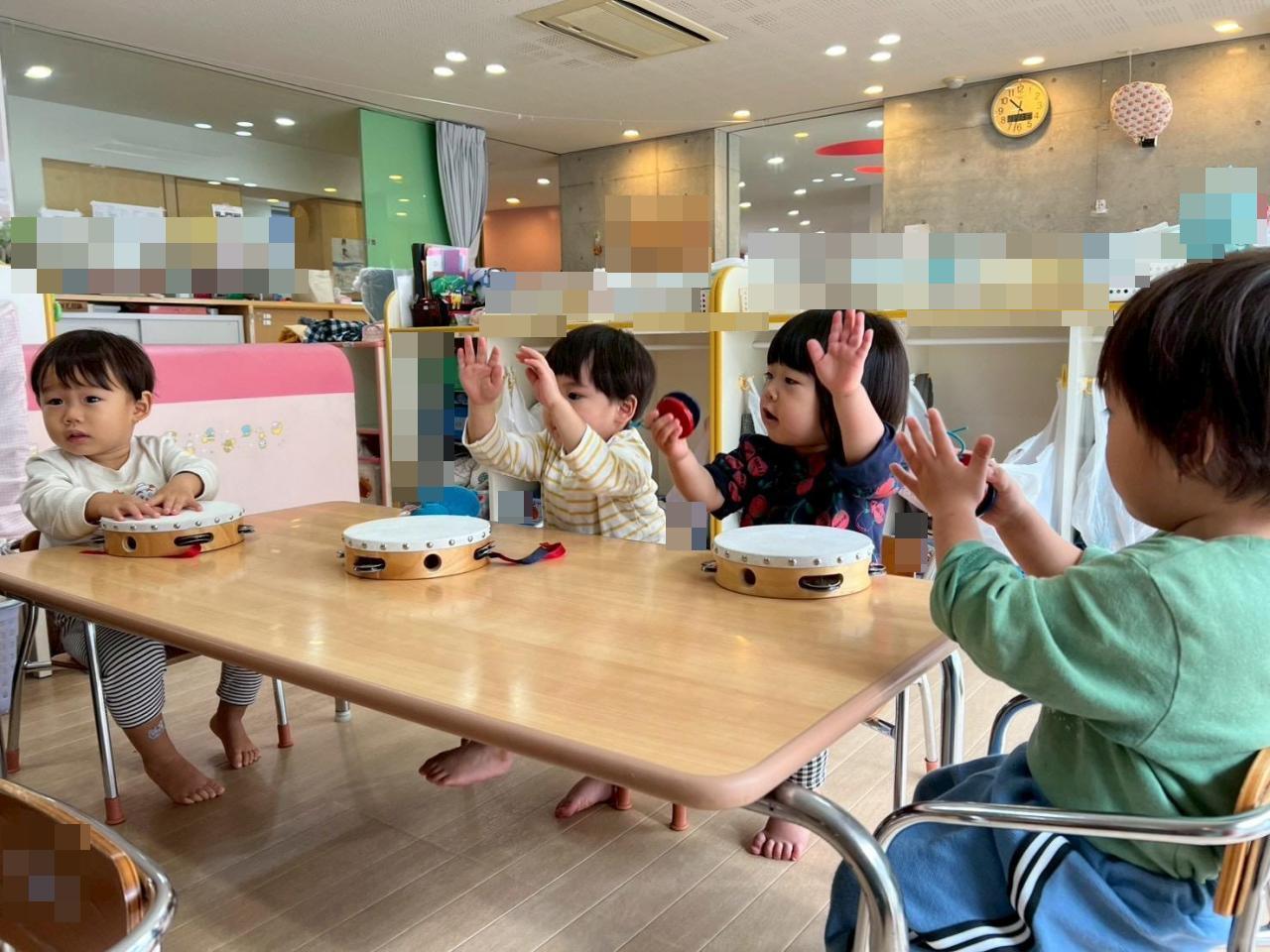 以前も触ったことのあるタンバリンやすずに加えて今月はカスタネットにも触れて楽器あそびをしましたよ🎶