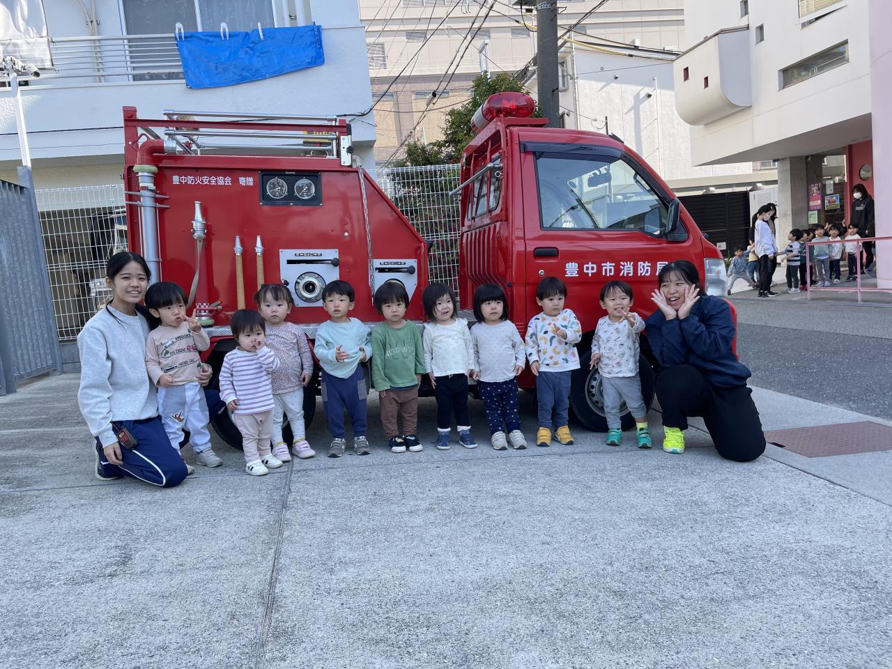 避難訓練では消防士さんが来てくれ、火事でのお話をしてくれました🧑🚒その後は消ちゃん号と一緒に写真を撮りましたよ📷
