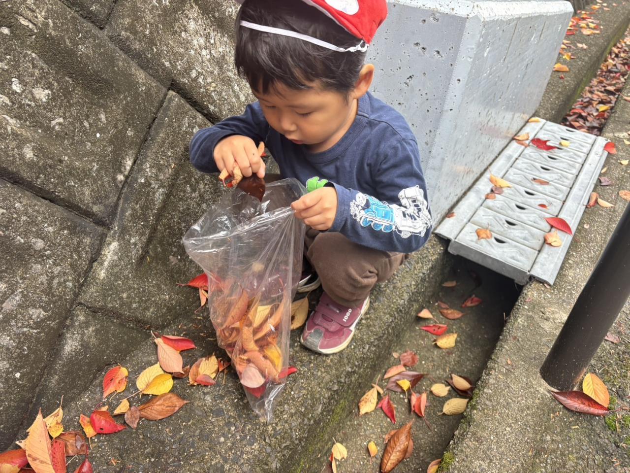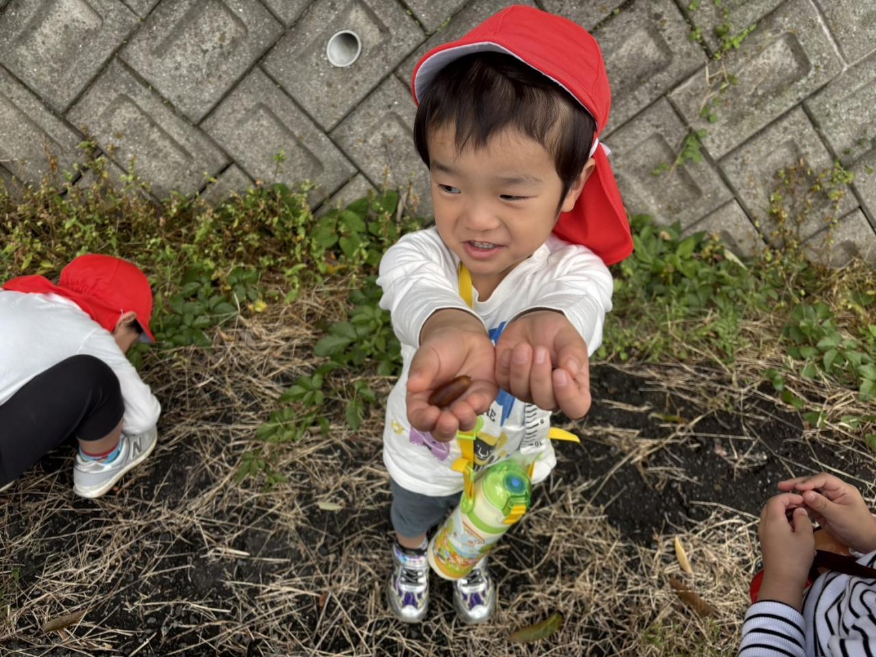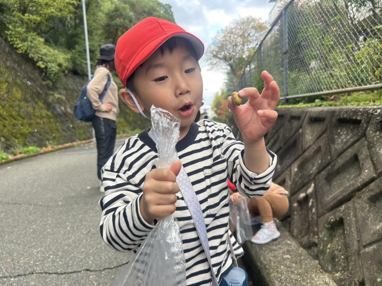 落ち葉やどんぐりを拾い、秋の自然物を見たり触れたりして楽しみました♪