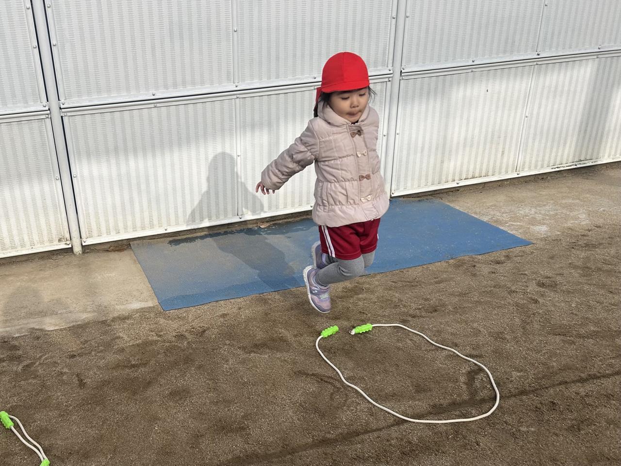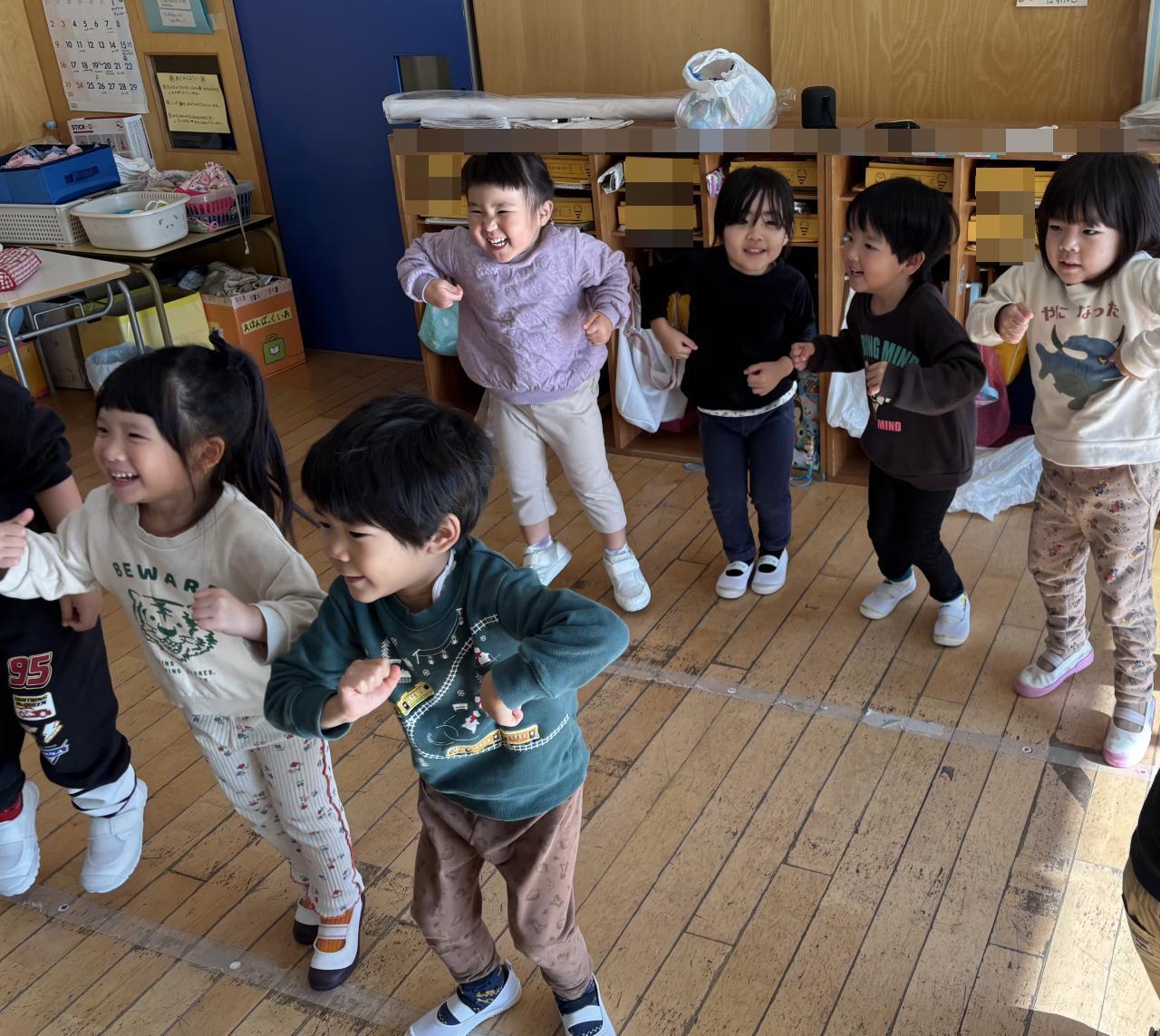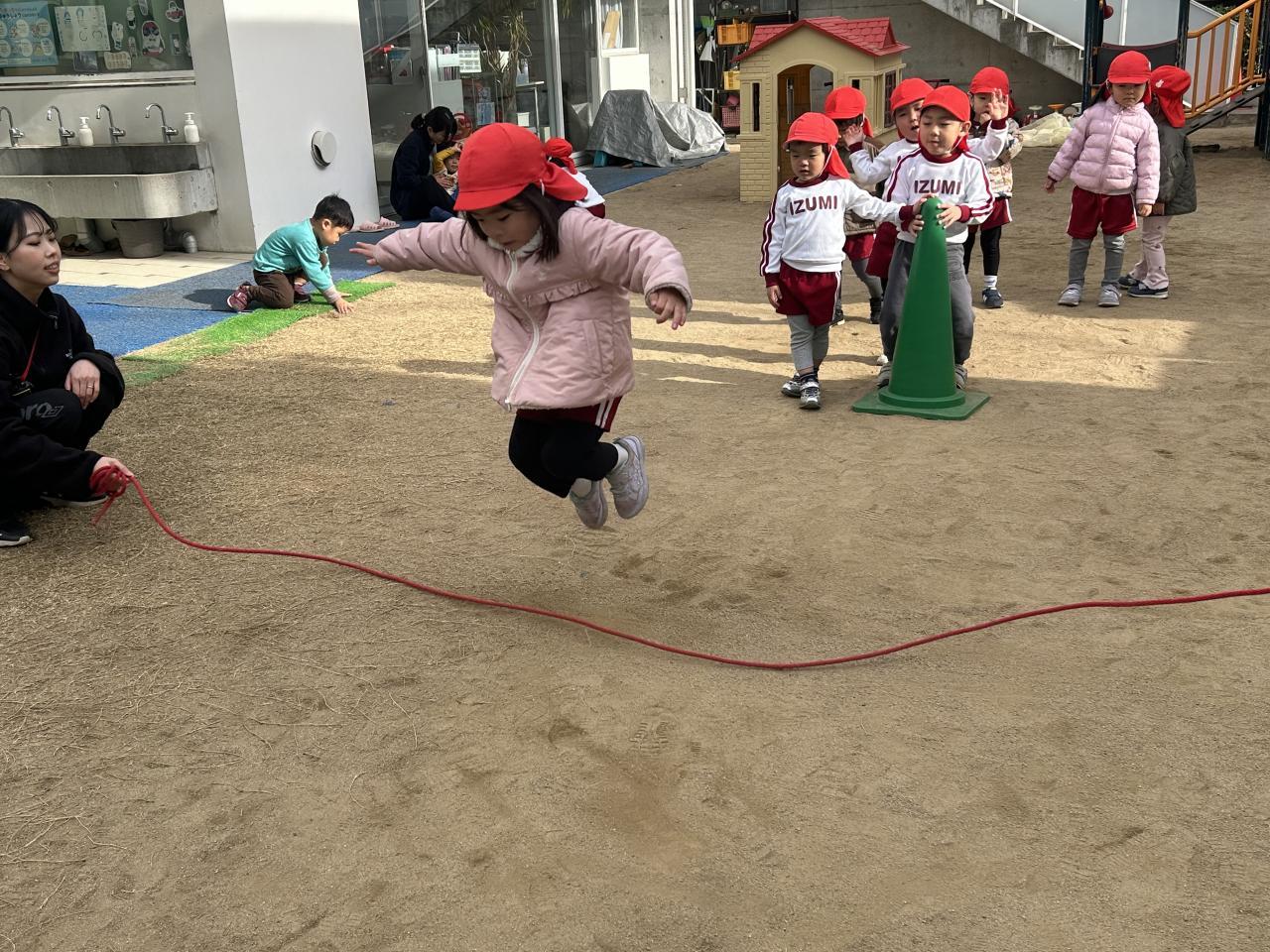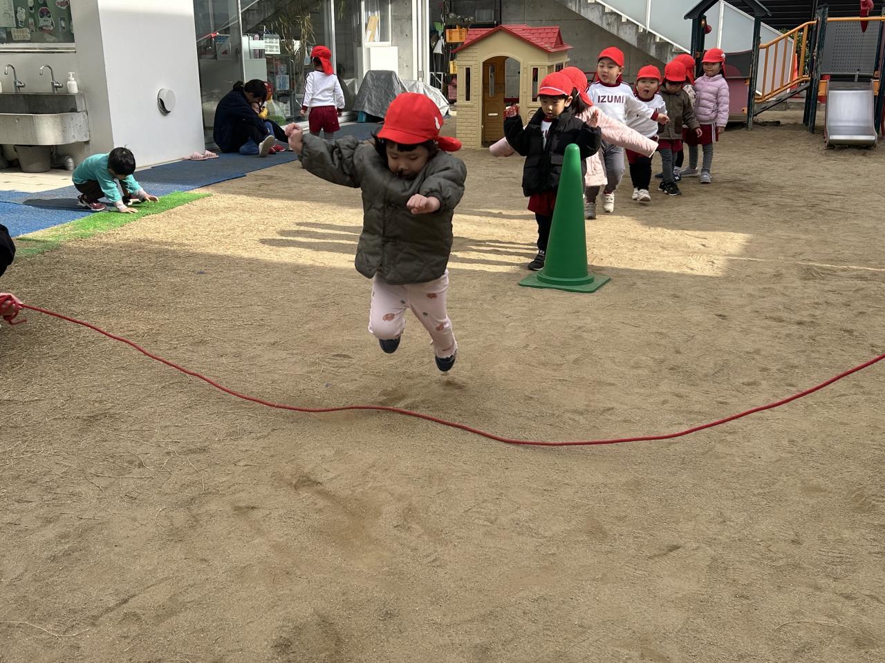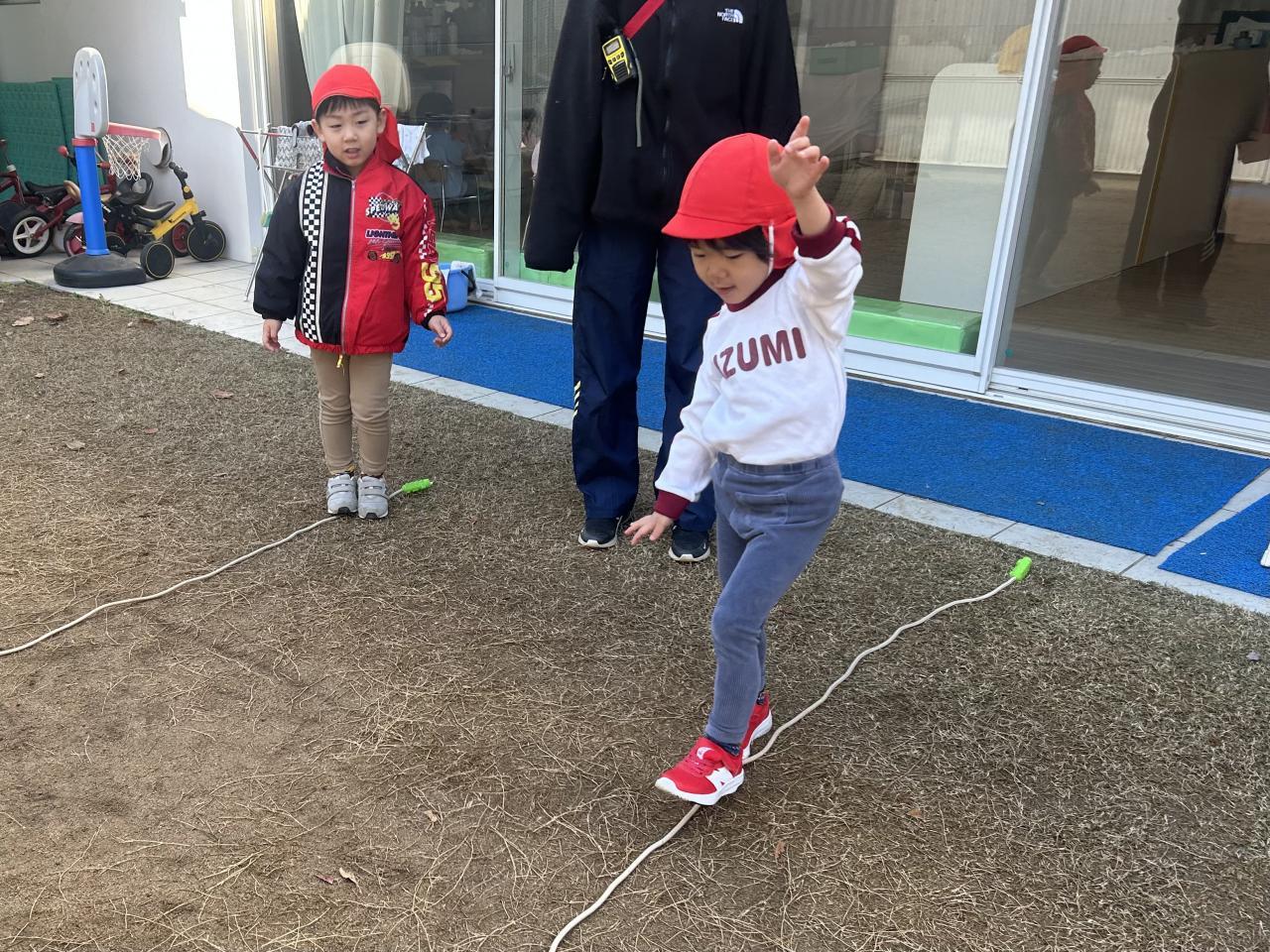 今月の体操あそびでは、なわとびに挑戦しました!1本の縄をみんなで飛び越えたり、一人ひとり縄を持ち、クルッと腕を回し前に来た縄を飛び越えたり、なわとびに親しむ活動をしました🎶
